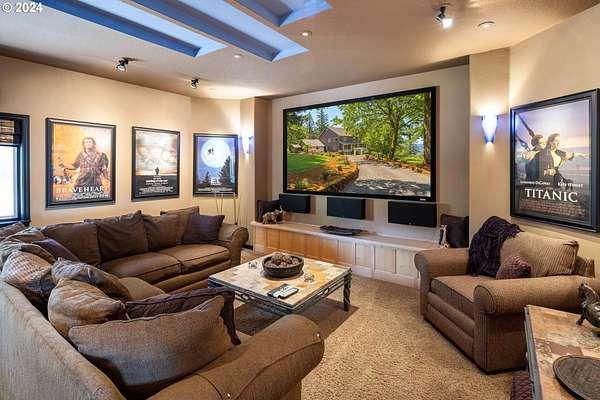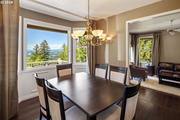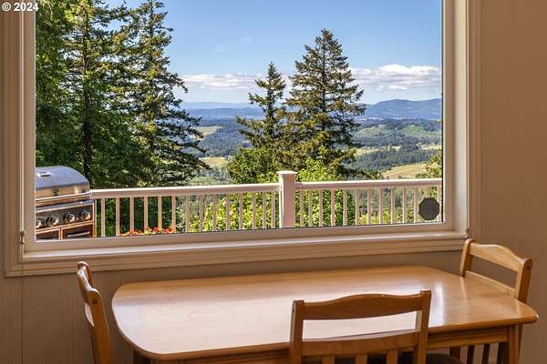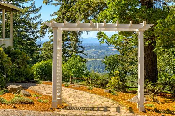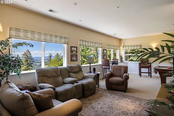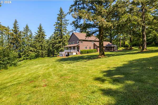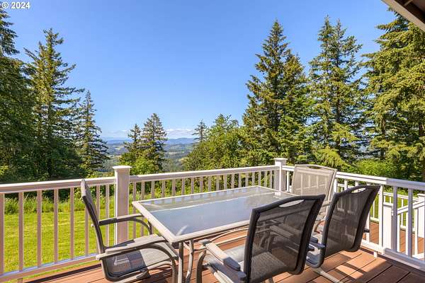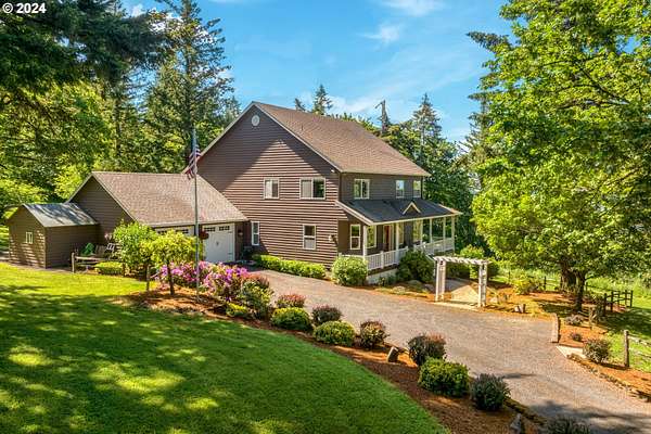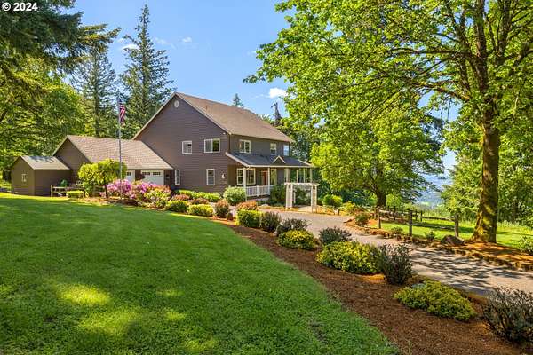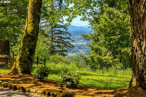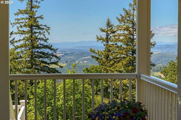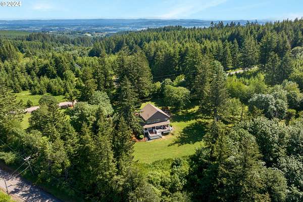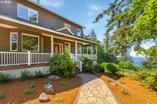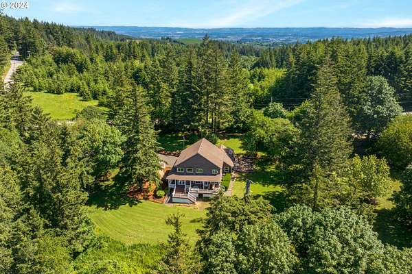 "The Summit at Finnigan Hill" is a hidden gem, where timeless elegance harmonizes with modern convenience. This beautiful traditional home is set on 6.21 acres of pristine landscaped grounds, offering stunning panoramic views of the coast range. The home features an expansive porch and deck, perfect for enjoying the breathtaking scenery, observing wildlife, and entertaining guests. Inside, the bright and flowing floorplan includes engineered hardwood floors and high ceilings, creating a spacious and inviting atmosphere. The well-appointed kitchen boasts Silestone counters, cheery breakfast nook, and stainless steel appliances including a smart fridge, smart dishwasher, built-in microwave, and range. The main level master suite boasts a walk-in closet and a luxurious bath with heated tile floors that conveniently connect to the laundry room. A second bedroom on the main level is located next to a full bathroom, ideal for guests or family members. Upstairs, an open family room (pool table included!) provides a great space for entertainment and relaxation. The closet in this room is perfect for storing games. Additionally, there is an exercise room and a media room with soundproofing in the walls and floor, scene lighting, a 106-inch screen, low voltage panel, and a wet bar for enjoying movie nights in style. Two more bedrooms upstairs share a full bath off the hall. A spacious garage completes the home with two 240v outlets which come in handy for electric vehicles. The exterior of the home features a pristine balance of grassy lawn and mature trees, providing both beauty and privacy. A peaceful retreat next to two wineries and yet centrally located to commuter routes, the hi-tech corridor, and minutes from the heart of Newberg. Don't miss the opportunity to own this exquisite property with unparalleled views and exceptional features. Contact us today to schedule a private showing and experience the beauty and elegance of this stunning home for yourself!
