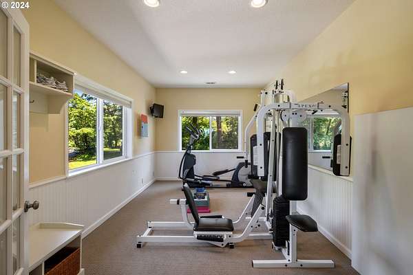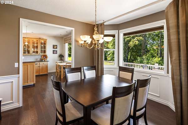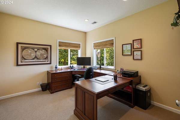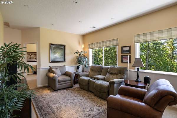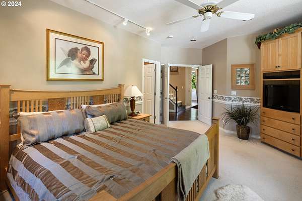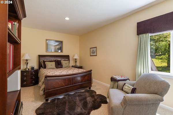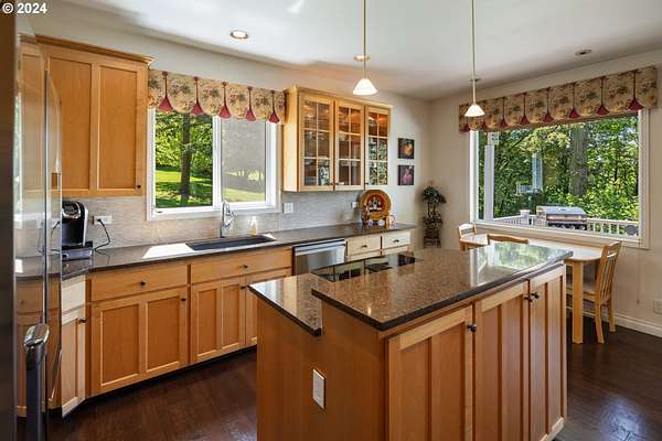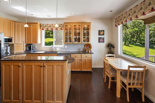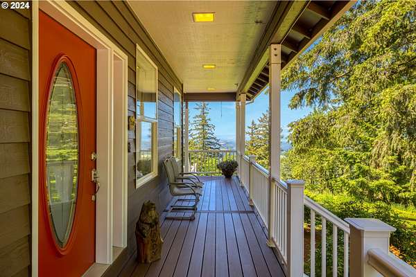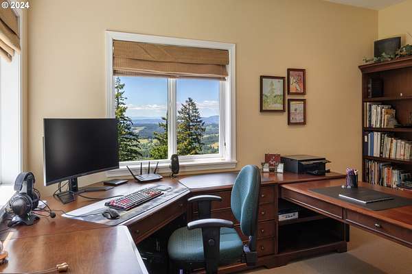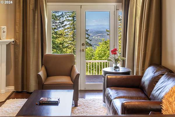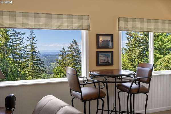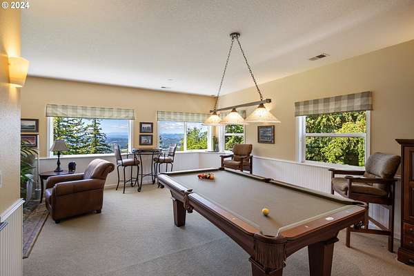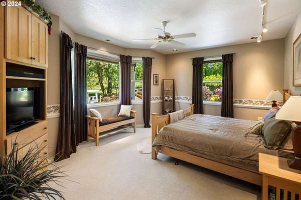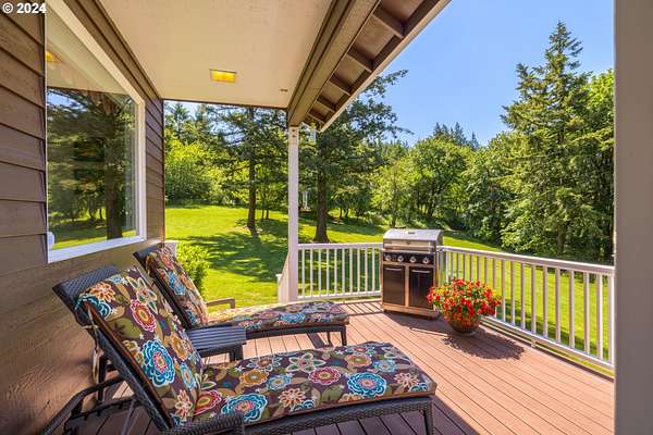 "The Summit at Finnigan Hill" is a hidden gem, where timeless elegance harmonizes with modern convenience. This beautiful traditional home is set on 6.21 acres of pristine landscaped grounds, offering stunning panoramic views of the coast range. The home features an expansive porch and deck, perfect for enjoying the breathtaking scenery, observing wildlife, and entertaining guests. Inside, the bright and flowing floorplan includes engineered hardwood floors and high ceilings, creating a spacious and inviting atmosphere. The well-appointed kitchen boasts Silestone counters, cheery breakfast nook, and stainless steel appliances including a smart fridge, smart dishwasher, built-in microwave, and range. The main level master suite boasts a walk-in closet and a luxurious bath with heated tile floors that conveniently connect to the laundry room. A second bedroom on the main level is located next to a full bathroom, ideal for guests or family members. Upstairs, an open family room (pool table included!) provides a great space for entertainment and relaxation. The closet in this room is perfect for storing games. Additionally, there is an exercise room and a media room with soundproofing in the walls and floor, scene lighting, a 106-inch screen, low voltage panel, and a wet bar for enjoying movie nights in style. Two more bedrooms upstairs share a full bath off the hall. A spacious garage completes the home with two 240v outlets which come in handy for electric vehicles. The exterior of the home features a pristine balance of grassy lawn and mature trees, providing both beauty and privacy. A peaceful retreat next to two wineries and yet centrally located to commuter routes, the hi-tech corridor, and minutes from the heart of Newberg. Don't miss the opportunity to own this exquisite property with unparalleled views and exceptional features. Contact us today to schedule a private showing and experience the beauty and elegance of this stunning home for yourself!