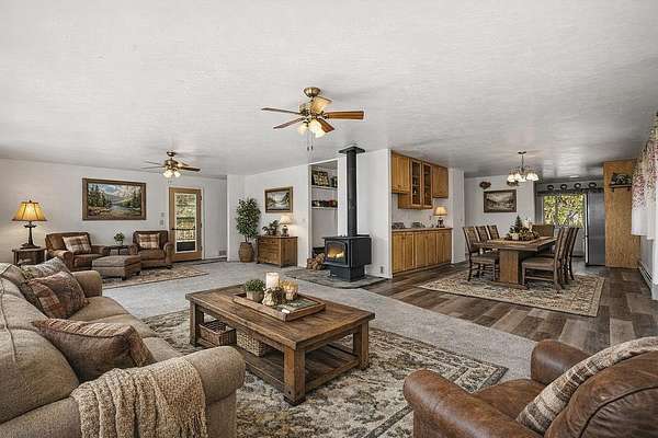 Sip your morning coffee while watching elk, deer, and other wildlife roam - a view that never gets old. This is more than a home - it's a lifestyle built for folks to slow down and take it all in. The house features multiple bedrooms upstairs, a full bath, and a spacious living room. There's also a main-floor bedroom and full bathroom, plus a basement with another full bath and room to build out more bedrooms or create a separate living space - ideal for multi-generational living, guests, or hired hands. For your gear and tools, there's a heated, finished detached 4-car garage and an additional 30x36 equipment shed. Whether you're storing hunting rigs, ranch equipment, or ATVs - you're covered. All of this sits on 17 private, fully fenced acres that border thousands of acres of BLM land - giving you direct access to prime hunting, riding, and exploring without ever loading up a trailer. Kimball Creek runs year-round through the property, providing excellent water for livestock and wildlife. A solid bridge crosses the creek, opening up even more space for camping, grazing, or just enjoying the land on foot, horseback, or wheels. If you've been looking for a place where the wild is right out your window, and the possibilities are as big as the skies overhead - this is it.
