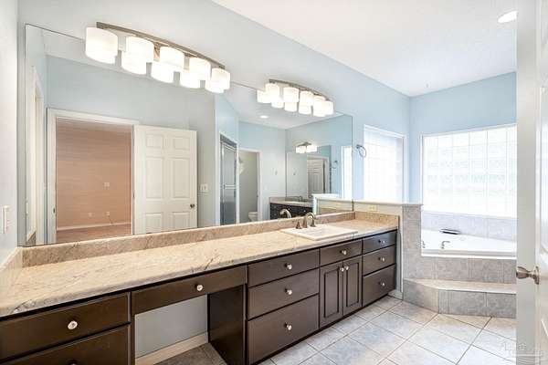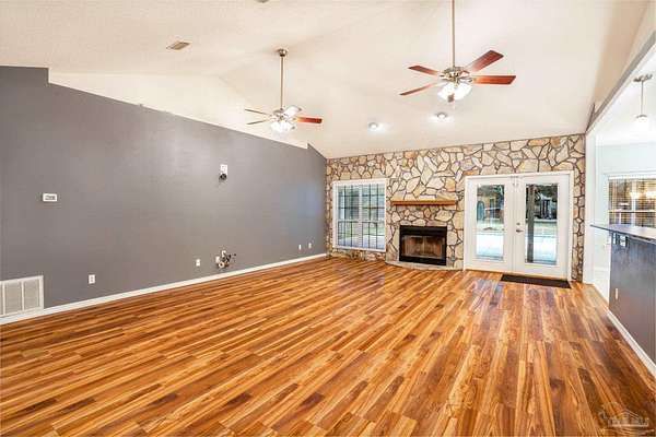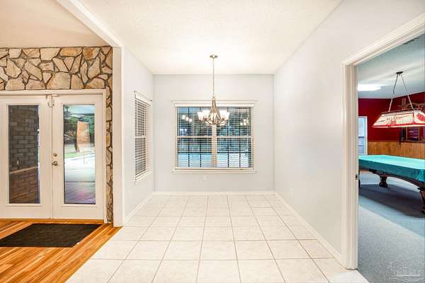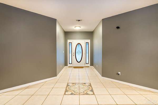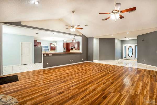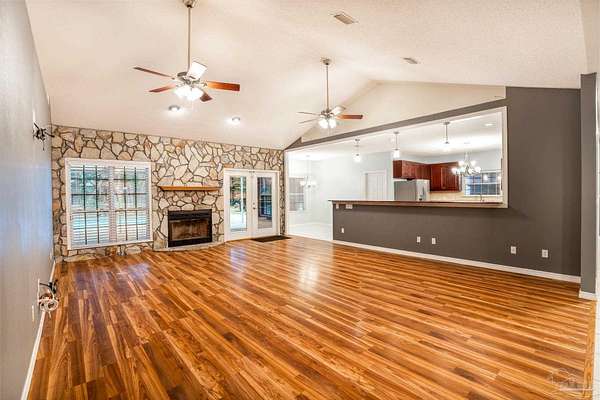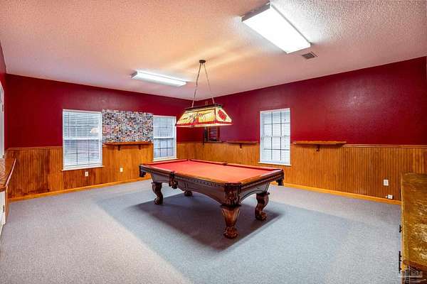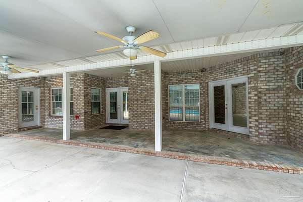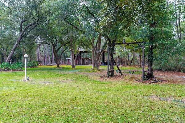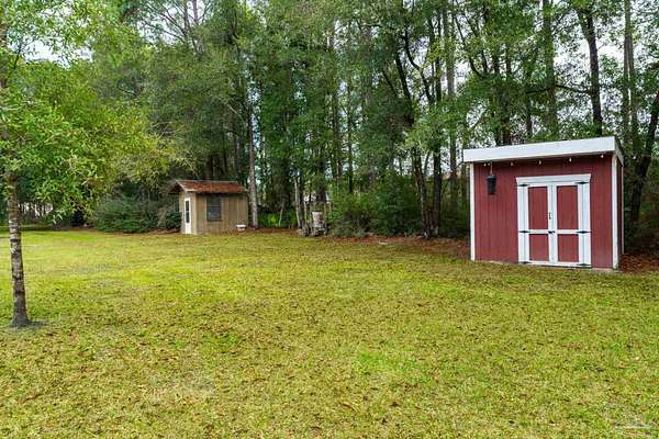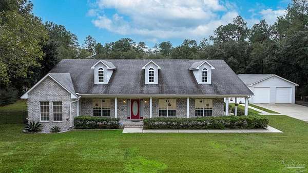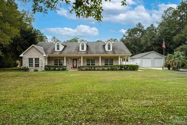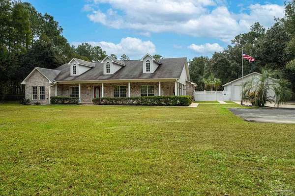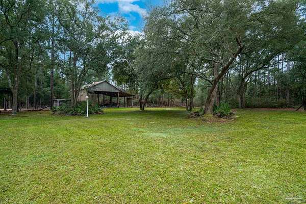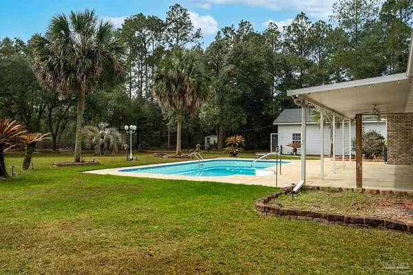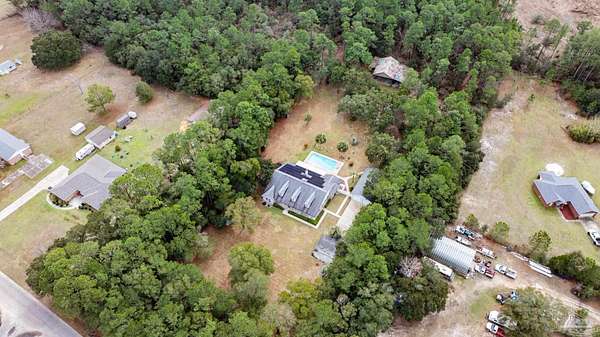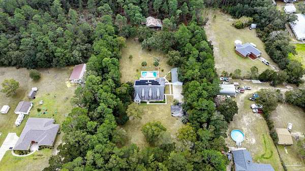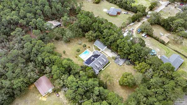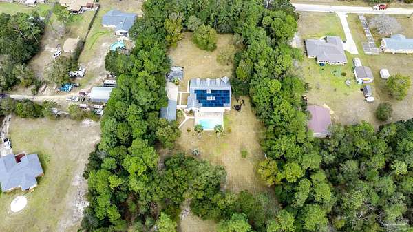 Sit on your wrap around porch and discover 4 acres of privacy in Florida, ideally located just 20 minutes from downtown, close to the interstate, and only 30 minutes to the beach. Surrounded by beautiful trees, this property offers seclusion without sacrificing convenience-with no HOA. Lots of freedom living here at this estate. Inside, the spacious layout is perfect for multi-generational living, featuring a generous primary suite plus two additional en-suites/Mother-in-law suites. The open kitchen has been updated with granite countertops, modern appliances, and refreshed bathrooms with new sinks, lighting, and fixtures. Stylish tile flooring runs throughout main entry area and wet areas, giving the home a fresh clean feel. Laminate in the living areas and carpet in bedrooms. Step outside to your own private oasis. A covered porch overlooks the sparkling pool and expansive backyard-ideal for relaxing or entertaining. A massive pole barn with oversized doors offers endless possibilities: storage, detached 2-car garage, workshop, or recreational space, complete with RV hookup. There's also a separate climate-controlled finished office/gym/storage on the back of the garage, a luxury chicken coop with caged run, and plenty of room for boats, RVs, and toys. This property extends about 50 yards beyond the back fence, providing even more space to enjoy. Solar panels keep energy costs extremely low (with option to pay off and remove if preferred. quotes in hand), adding efficiency and long-term savings. All this, plus the convenience of being minutes from Navy Federal Credit Union and only a short drive to the Gulf Coast beaches, makes this estate the perfect blend of privacy, function, and lifestyle. New Arcitectural Shingle roof installed prior to closing with applicable offer.