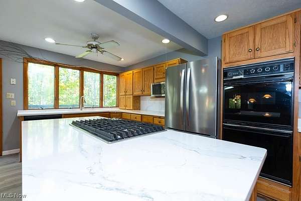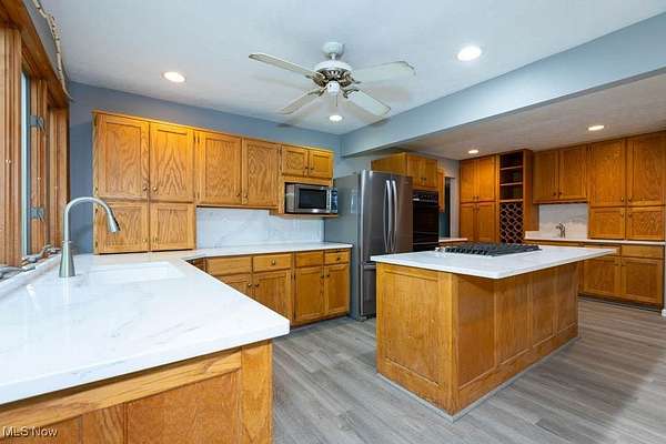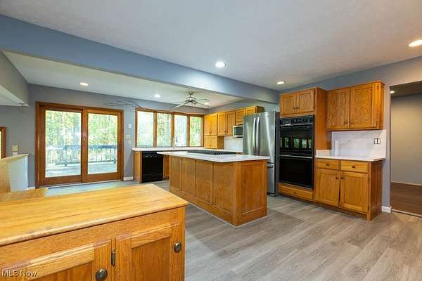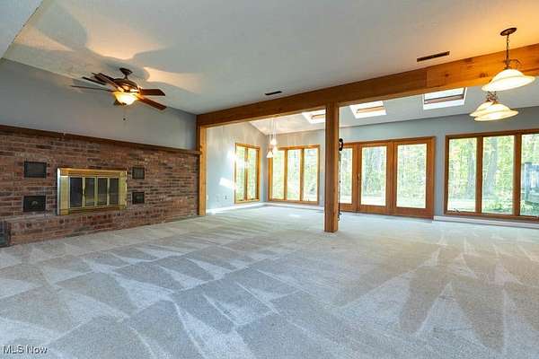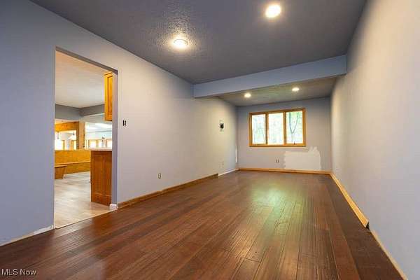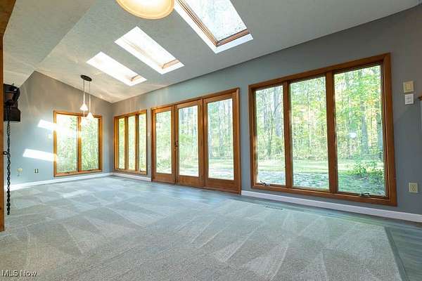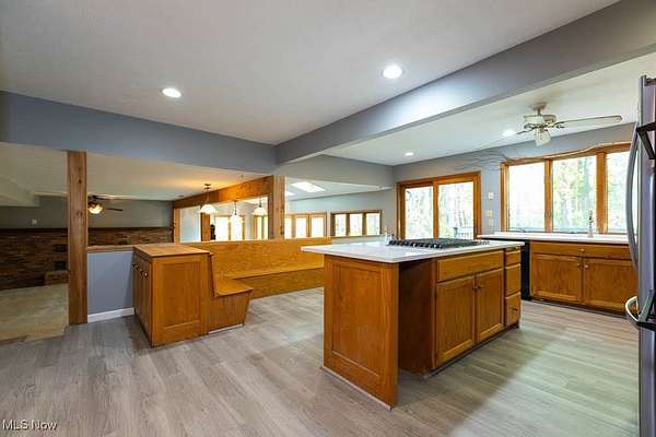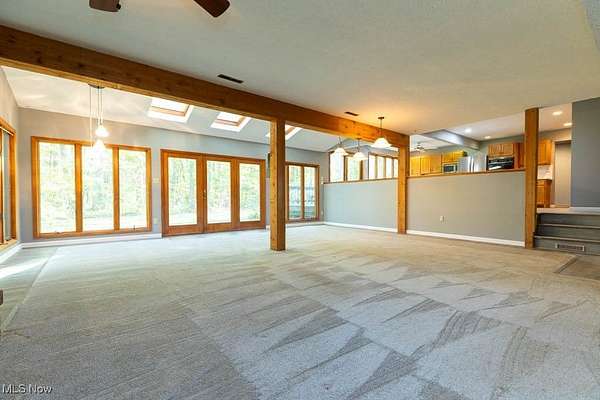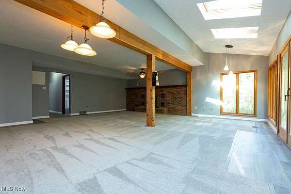 Tucked away on over an acre and a half of land, this 4-bedroom, 3-bathroom split-level home is located in the highly ranked Kenston School District! With 2,714 soft of living space, this home offers a fantastic layout and plenty of potential. Come inside to an entrance foyer that leads to the bright living room, which flows seamlessly into the dining room-perfect for gatherings. The kitchen is well-equipped with an island and breakfast bar, high quality countertops, a double wall oven, lots of cabinet space, recessed lighting, LVP flooring, and a wet bar. The spacious lower-level family room features a fireplace and is bathed in natural light thanks to skylights. A main-floor bedroom, a fully updated bathroom, and a convenient laundry room complete this level. Upstairs, you'll find three bedrooms, including the master bedroom with a walk-in closet. The master bathroom is a complete gut job, ready for a new vision and remodel. the unfinished basement houses a sump pump, water softener, a 2015 furnace, and a 2018 hot water tank. Outside, the attached two-car garage adds convenience. The roof and gutters are believed to be around 5 years old. A/C unit is 1996. Located just minutes from shopping and with easy access to US-422, this home is a fantastic opportunity to add your personal touch. Don't miss out-schedule your showing today! Selling As-is.