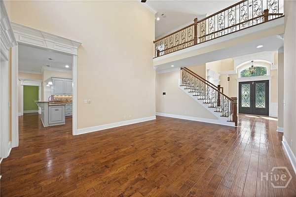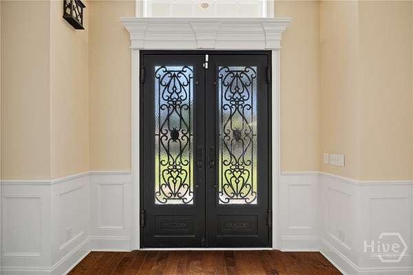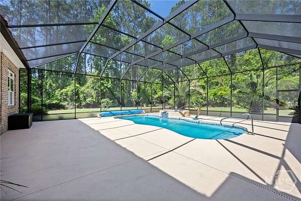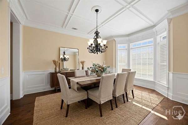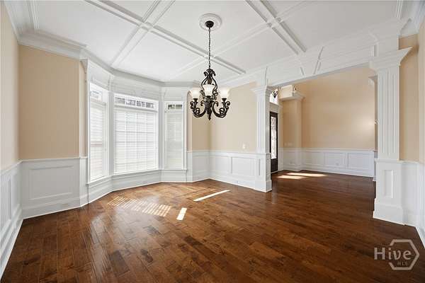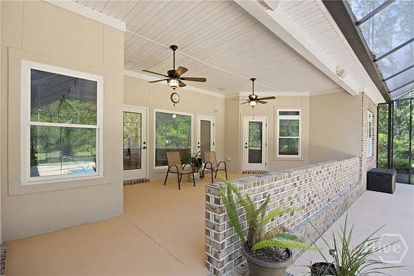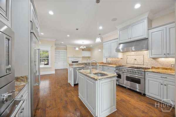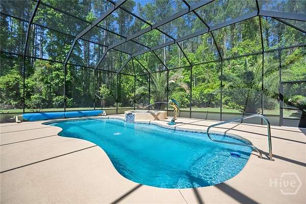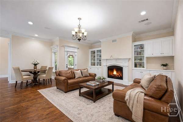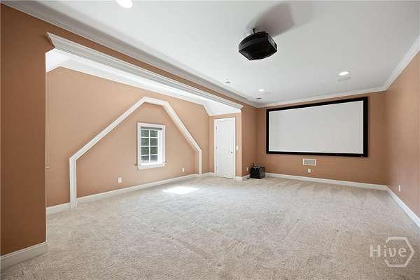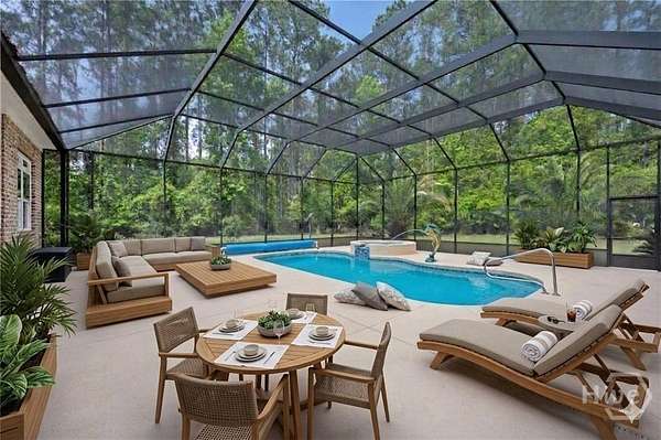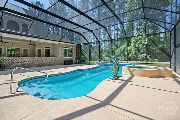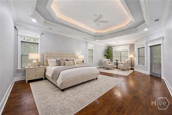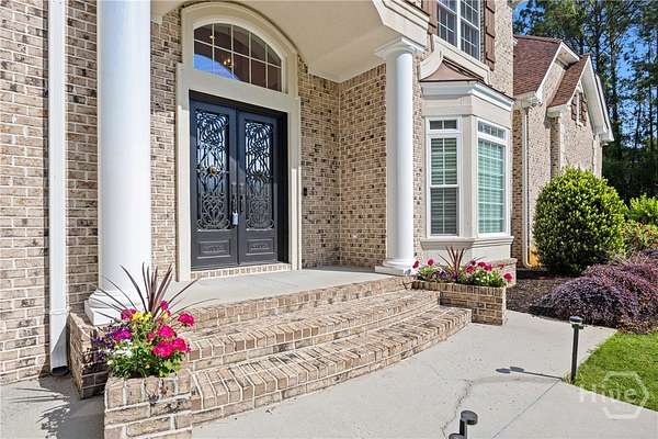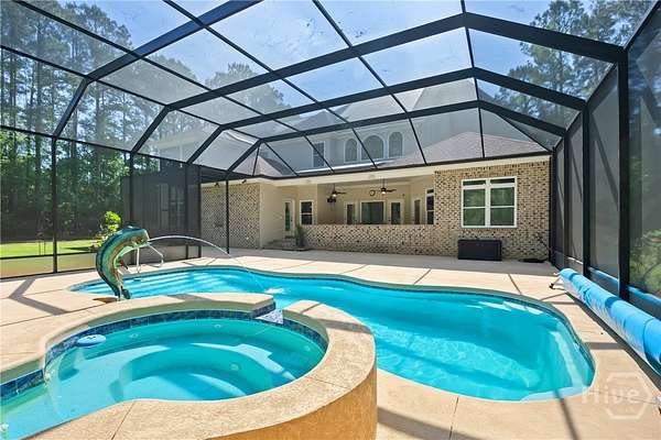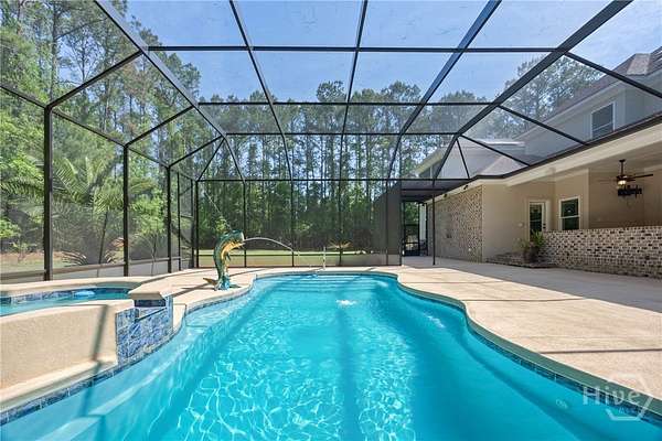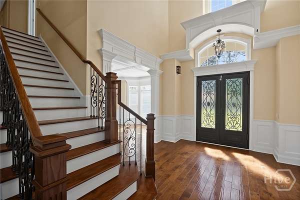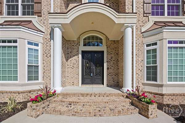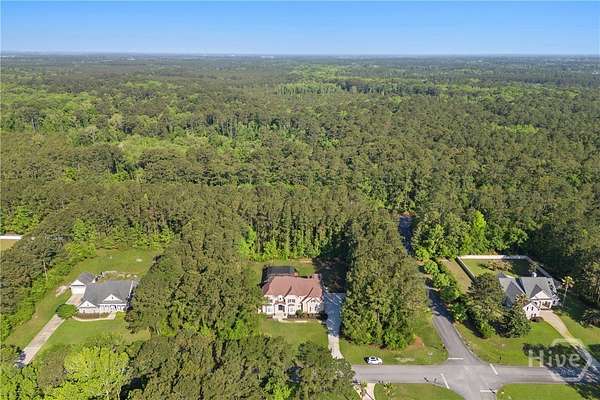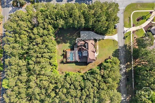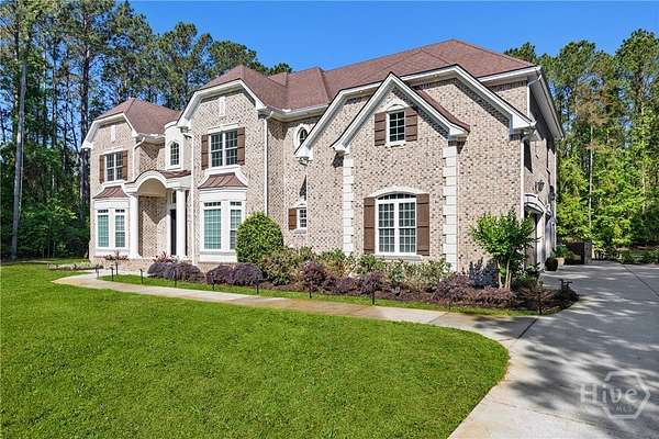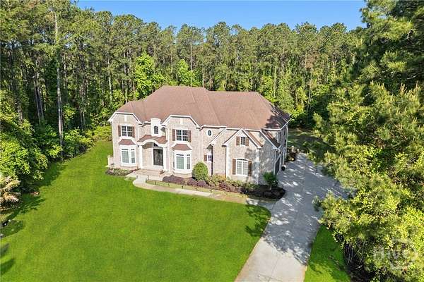 Welcome to living the perfect balance of quiet family life and grand-scale entertaining at 1913 Saint Catherine Circle. Tucked away on a sprawling 1.75-acre corner lot in the gated Bluffs at Richmond Hill, this custom estate intentionally crafted with a clear vision-plenty of room for big gatherings, with secluded corners for everyone to find their own peace and quiet. Step through the custom Italian entry doors into a grand foyer that sets the stage. You'll find a formal living room with soaring decorative ceilings and a dining area featuring timeless coffered ceilings-perfect for hosting holiday dinners that feel a little extra special. Throughout the home, warm wood floors and classic crown molding keep things feeling cozy and grounded. The heart of the house is the open-concept chef's kitchen, fully loaded with Viking appliances and a breakfast bar flowing right into a sunny breakfast nook and a relaxed den with a fireplace, making it the go-to spot for your morning coffee or a low-key movie night. When you're ready to unplug, the main-level owner's suite is a true retreat, complete with a sitting area, dressing room, en-suite bath with separate shower, double vanity, whirlpool tub and its own private entrance to the pool. Additional main-level guest suite ideal for multigenerational living. Upstairs, three additional private bedrooms, with private bath tucked away so not to disturb the peace downstairs. The fun continues with a movie theater, separate wet bar area opening to an enclosed balcony. Outside, your private backyard oasis awaits: enclosed patio with heated pool, hot tub featuring a dolphin waterfall, and dedicated outdoor cooking area for weekend BBQs. Smart as it is beautiful, the home features solar panels with Enphase battery backup and private well for the irrigation system. Short distance to Richmond Hill's newest schools, local marinas, and an easy commute to downtown Savannah, Airport, Ft. Stewart, Hyundai, GA Ports and three GA beaches.