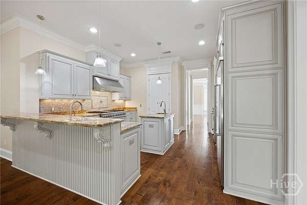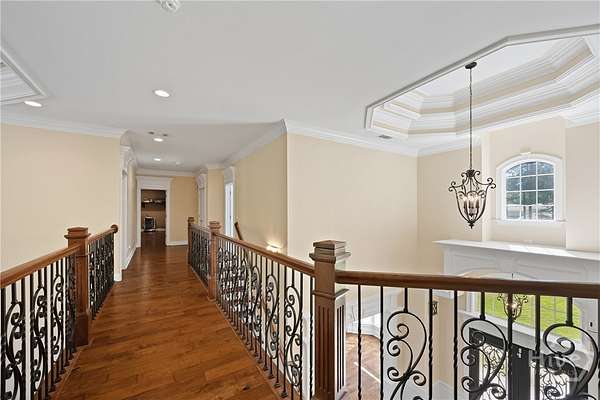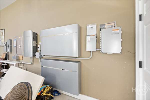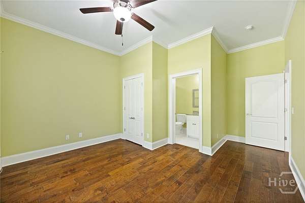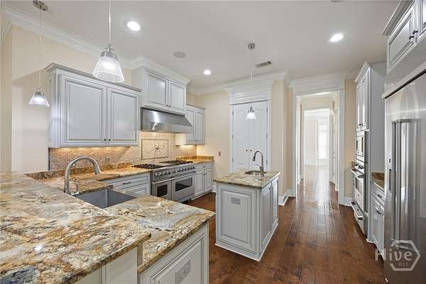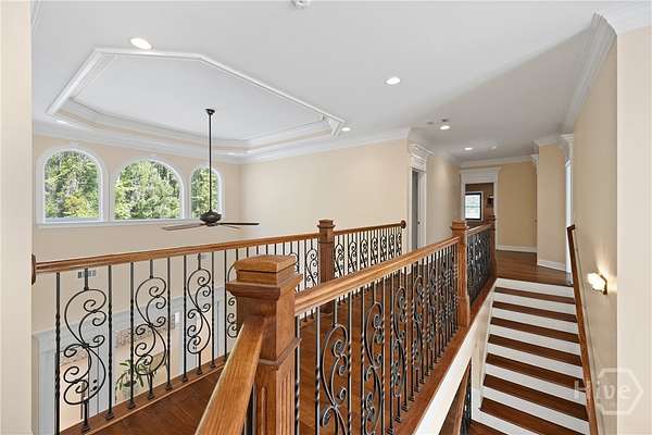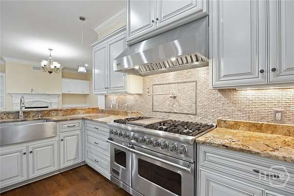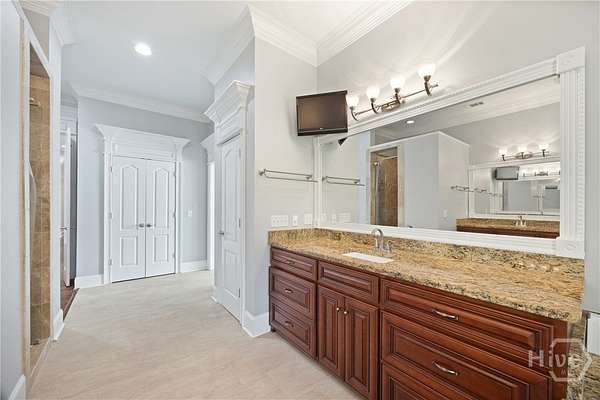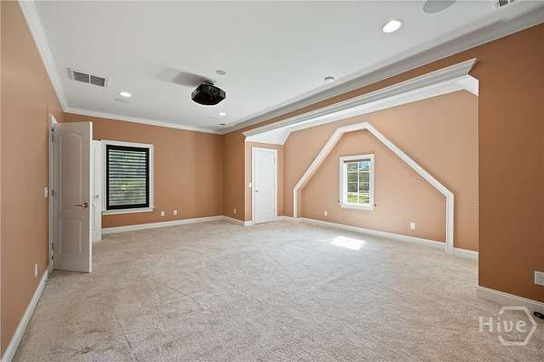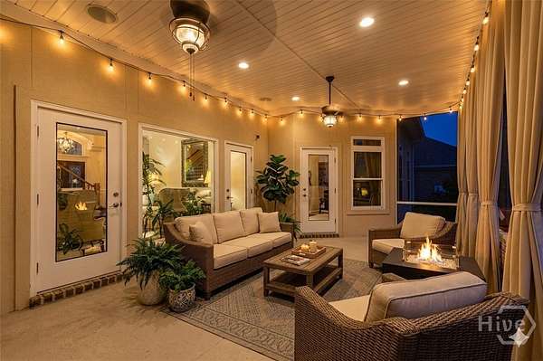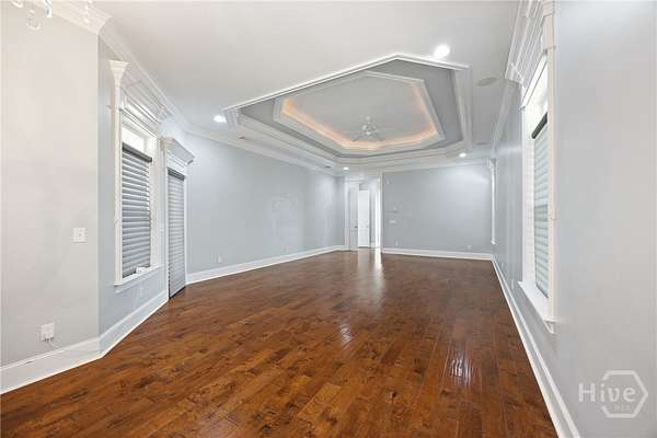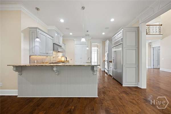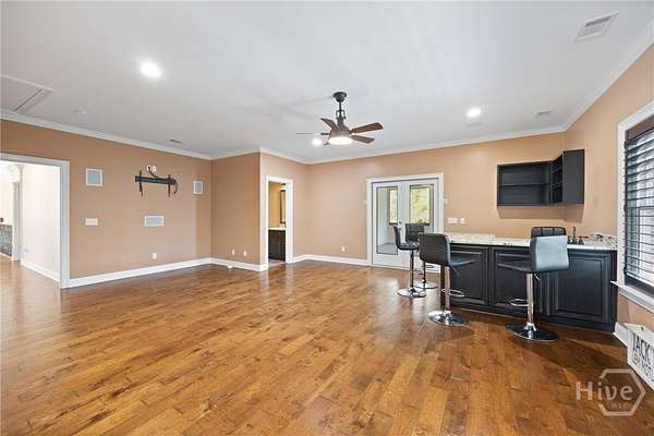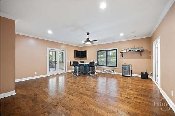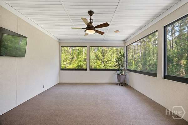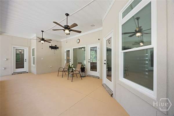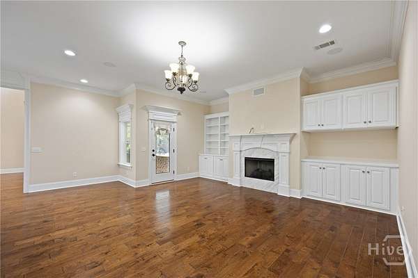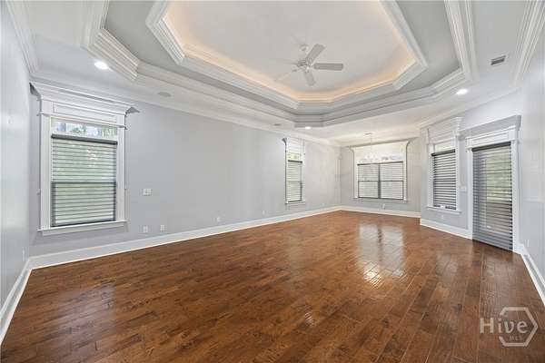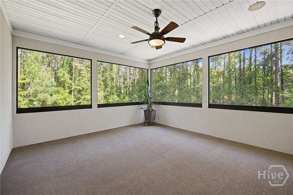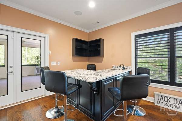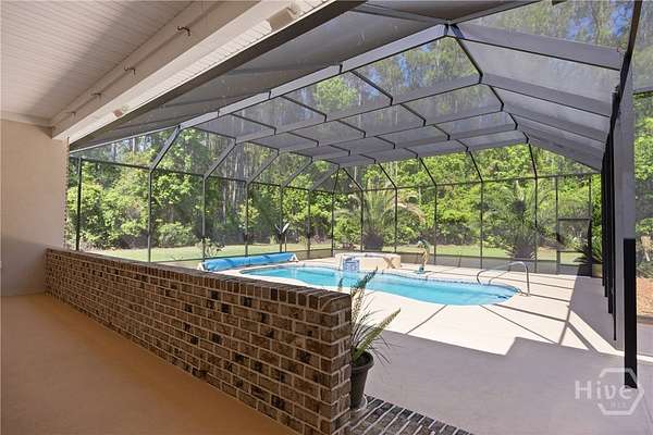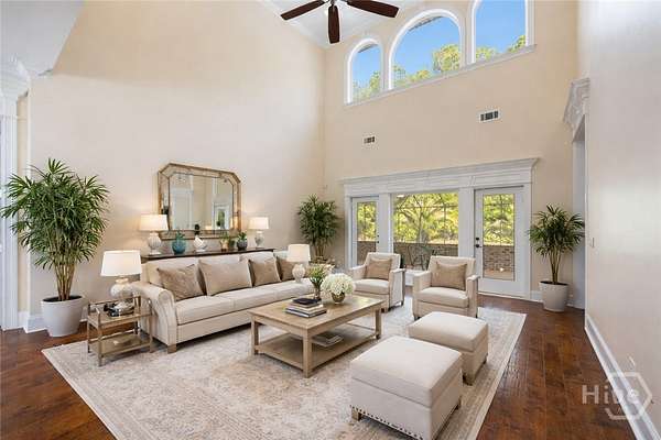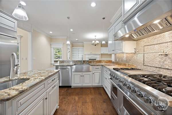 Welcome to living the perfect balance of quiet family life and grand-scale entertaining at 1913 Saint Catherine Circle. Tucked away on a sprawling 1.75-acre corner lot in the gated Bluffs at Richmond Hill, this custom estate intentionally crafted with a clear vision-plenty of room for big gatherings, with secluded corners for everyone to find their own peace and quiet. Step through the custom Italian entry doors into a grand foyer that sets the stage. You'll find a formal living room with soaring decorative ceilings and a dining area featuring timeless coffered ceilings-perfect for hosting holiday dinners that feel a little extra special. Throughout the home, warm wood floors and classic crown molding keep things feeling cozy and grounded. The heart of the house is the open-concept chef's kitchen, fully loaded with Viking appliances and a breakfast bar flowing right into a sunny breakfast nook and a relaxed den with a fireplace, making it the go-to spot for your morning coffee or a low-key movie night. When you're ready to unplug, the main-level owner's suite is a true retreat, complete with a sitting area, dressing room, en-suite bath with separate shower, double vanity, whirlpool tub and its own private entrance to the pool. Additional main-level guest suite ideal for multigenerational living. Upstairs, three additional private bedrooms, with private bath tucked away so not to disturb the peace downstairs. The fun continues with a movie theater, separate wet bar area opening to an enclosed balcony. Outside, your private backyard oasis awaits: enclosed patio with heated pool, hot tub featuring a dolphin waterfall, and dedicated outdoor cooking area for weekend BBQs. Smart as it is beautiful, the home features solar panels with Enphase battery backup and private well for the irrigation system. Short distance to Richmond Hill's newest schools, local marinas, and an easy commute to downtown Savannah, Airport, Ft. Stewart, Hyundai, GA Ports and three GA beaches.