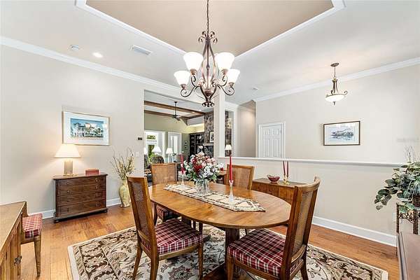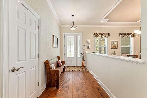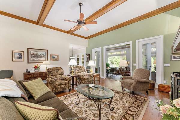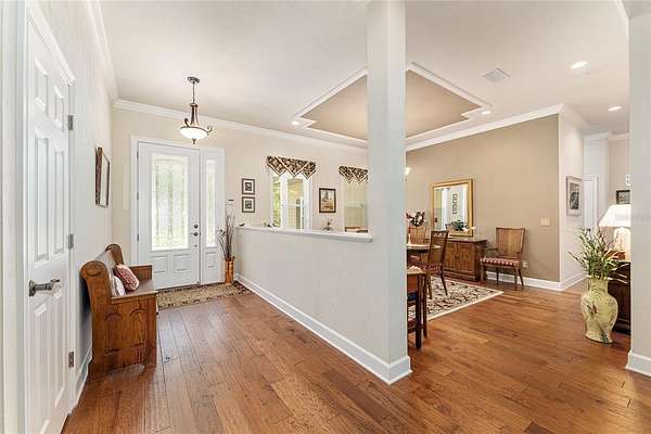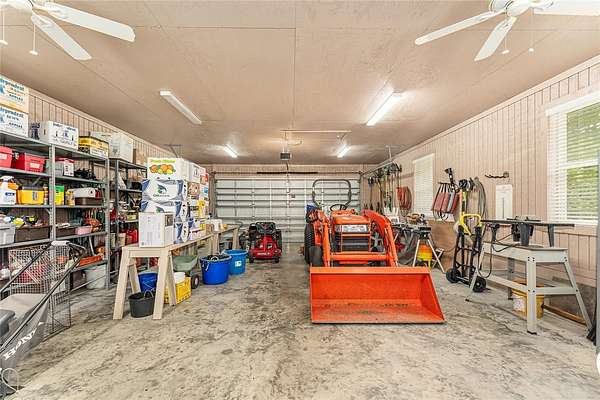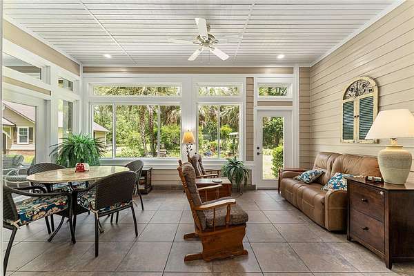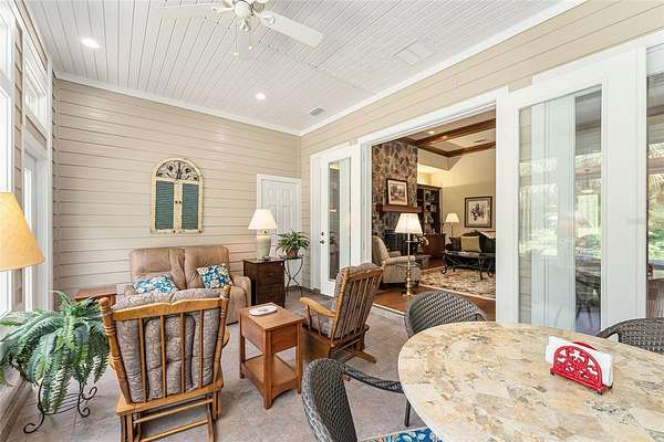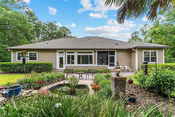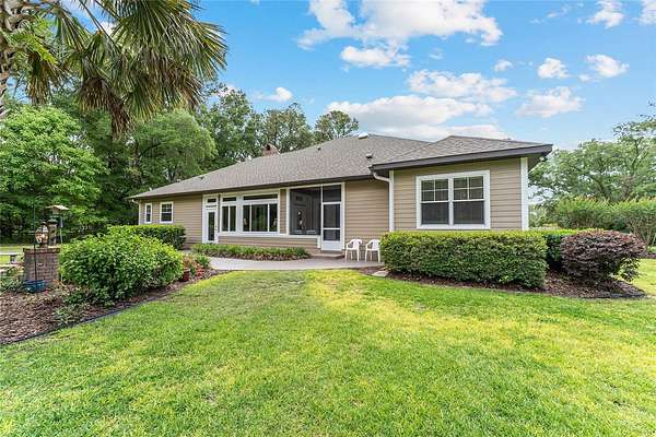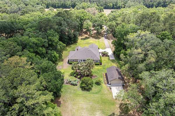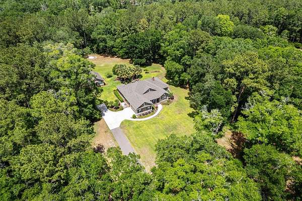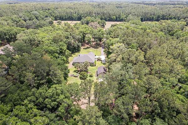 Don't miss this truly exquisite home on 5 beautiful wooded acres in the sought after Gated neighborhood of Santa Fe Forest. From the superior construction with 2x6 exterior walls, spray foam icynene insulation in attic, and Brand New Roof and A/C, to the meticulously maintained interior and exterior grounds, plus the wonderful detached workshop, you will not want to miss this special home. The home features 4 bedroom and 3 1/2 bath plus a wonderful light fill Florida room looking out to the meticulously maintained landscaping, koi pond, and all the wonderful nature living on 5 acres provides. As soon as you enter the home you will immediately notice the craftmanship and attention to detail with the beautiful hand scraped wood floors, high soaring ceilings, and crown molding. The light filled living room is spacious and features a fantastic rock fireplace, wood built-in, and custom wood beamed ceiling. The huge formal dining room has space for all family gatherings. The dream kitchen features new quartz countertops, double wall ovens, custom butcher block island, and all the counterspace and cabinet space you could want. The huge primary bedroom also features beautiful wood floors and crown molding, has 2 large walk-in closets, and a luxury bath with separate shower, jetted tub, and dual vanities. The second bedroom has tile floors and it's own desk area and full bathroom and works great as an office, craft room, or nursery. The large third bedroom on the other end of the house and is perfect for guests. The fourth bedroom is also spacious and is next to the full guest bathroom. This home has tons of storage space with multiple storage closets and linen closets. Plus indoor laundry room and 1/2 bath. In addition to the wonderful Florida room you also have a great screen back porch with outdoor kitchen. The 5 fully fenced acres has it's own private gate, an attached 2 car garage, and a detached garage/workshop. Clay electric for super low utility bills, well with newer pump and high end UV filter and softener for fantastic water, plus an attached gas generator. There are way too many features to list so call today for your own private tour of this amazing property.