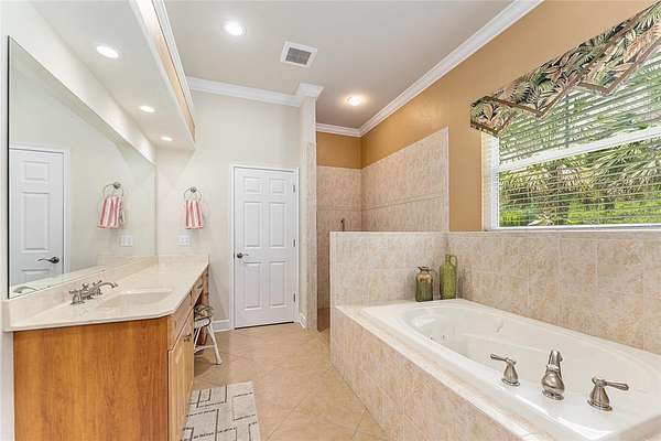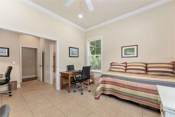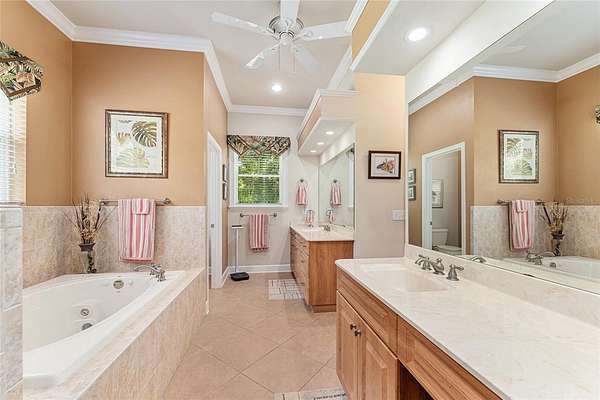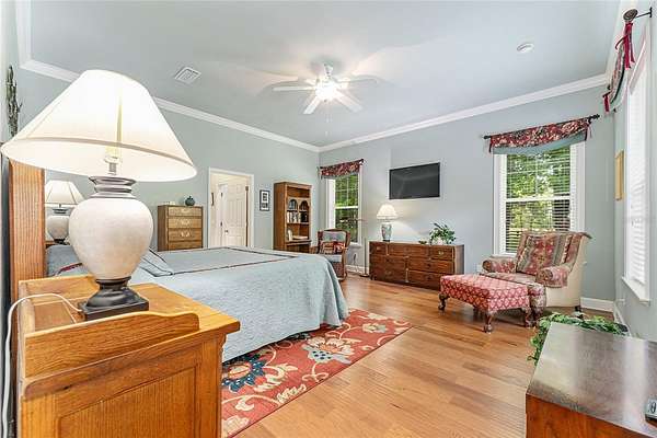 - Ceiling Fans(s), Chair Rail, Crown Molding, High Ceilings, Primary Bedroom Main Floor, Solid Surface Counters, Solid Wood Cabinets, Split Bedroom, Stone Counters, Walk-In Closet(s), Window Treatments