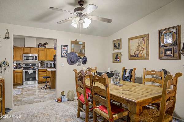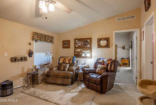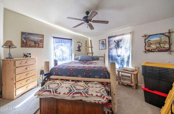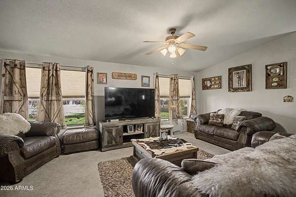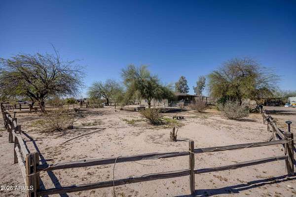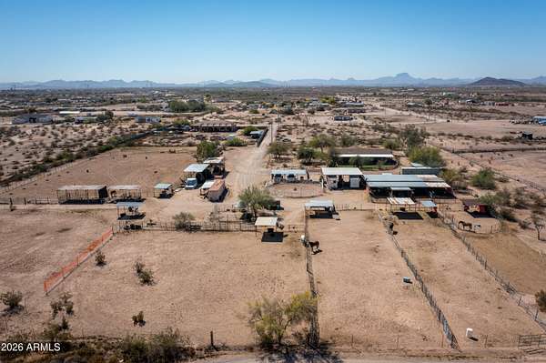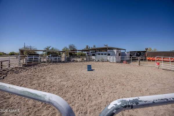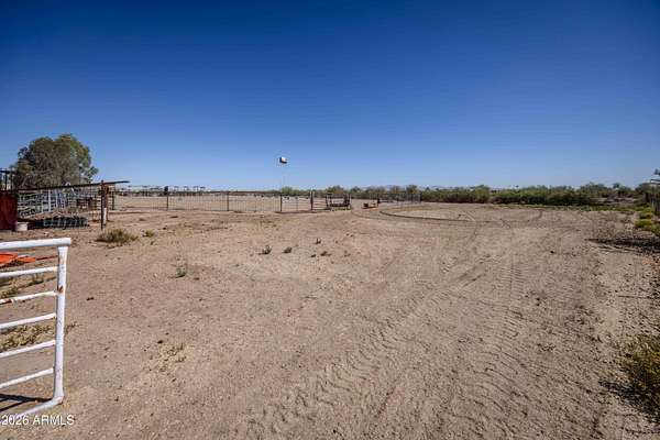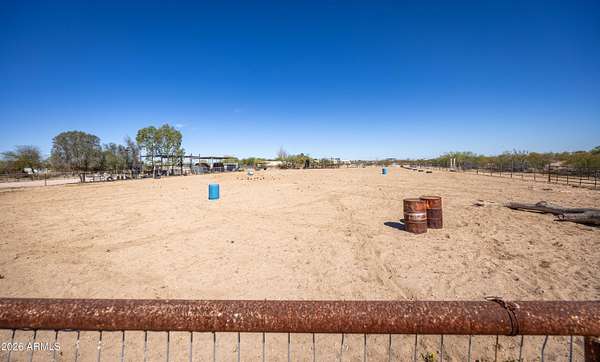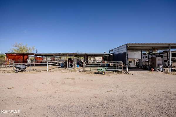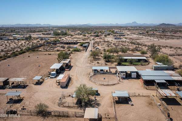 Ranch style living at its finest! This stunning 2240 sq ft manufactured home sits proudly on nearly 6 acres of land, complete with private well ensuring a steady water supply. Equestrian enthusiasts will love the roping arena, 6 car shades, and 2 horse trailer shades, perfect for storing your gear. The 5 horse turn-out pens and 6 stall open barn offer ample space for your equine friends, while the round pen provides a safe area for training. The beautiful north facing back patio is perfect for relaxing, surrounded by lush lawn and fenced for your furry friends. With plenty of storage and outdoor living space, come check this one out. This listing is includes 3 parcels: 504-12-101, 504-12-102, 504-12-103