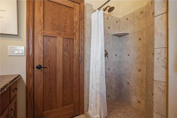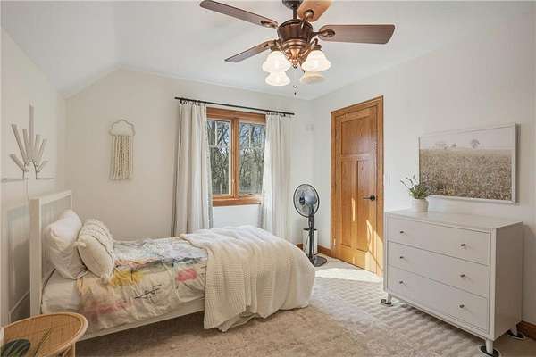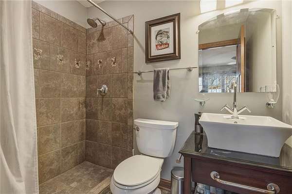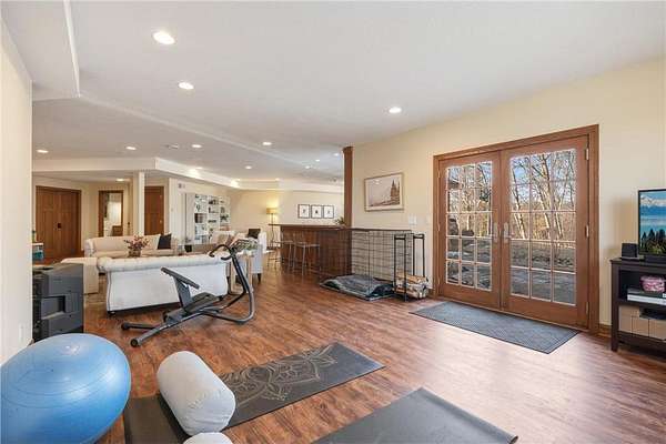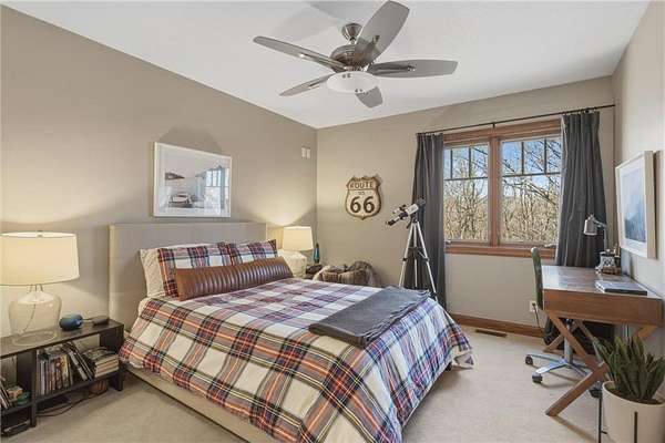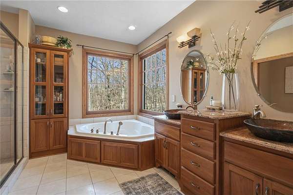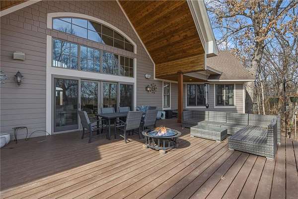 The home is equipped with in-floor heating throughout. The heated four-car garage even includes an elevator for easy transport of your belongings into the house! Outside, you'll find ample deck and patio space, perfect for entertaining or simply enjoying the tranquility of the private wooded surroundings.