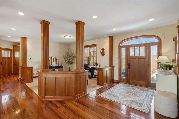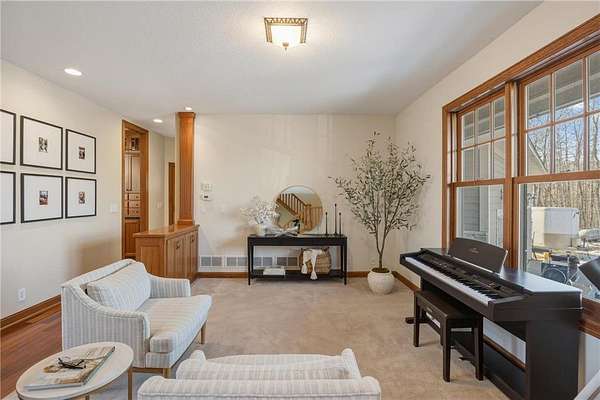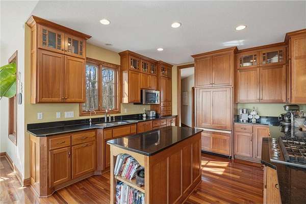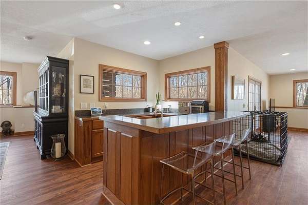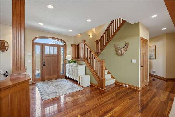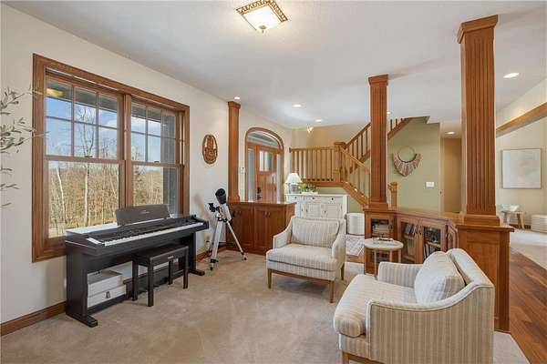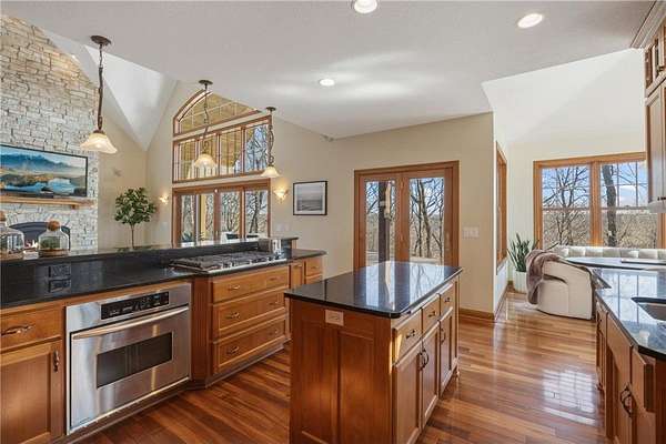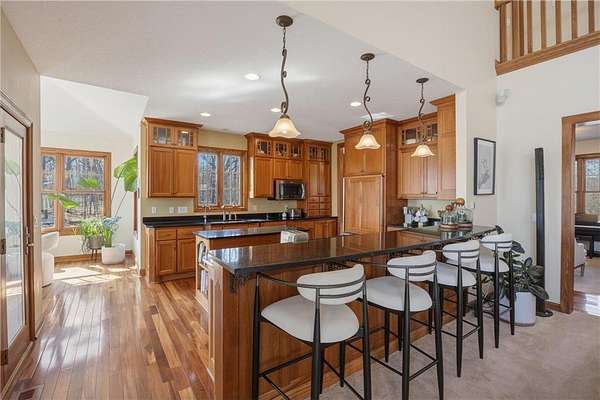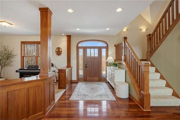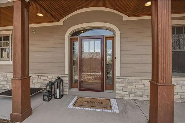 Welcome to 19155 263rd St, an exceptional custom-built home situated on 2.5 private acres along the St. Croix River in the prestigious St. Croix Bluffs neighborhood. This unique estate features a stunning floor-to-ceiling stone fireplace and impressive towering ceilings, along with cherrywood custom cabinets and tigerwood hardwood floors.