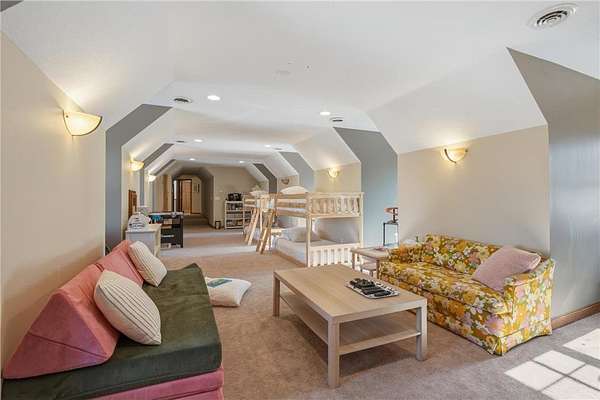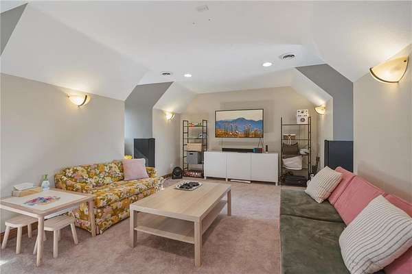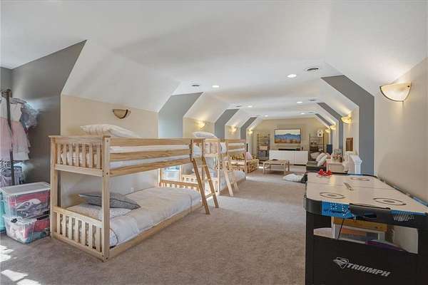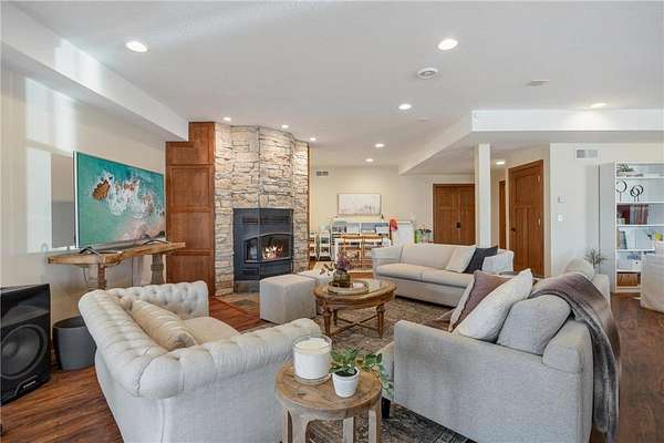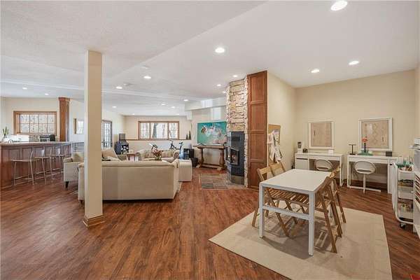 Upstairs, you will find two bedrooms—one with an en-suite bath—as well as a generous bonus room, ideal for a children's play area, a flexible room, a movie room, or a creative space. The large open basement features a family room with a wood-burning fireplace and wet bar, a bathroom with a walk-in steam shower, and additional unfinished flex space currently used as a hobby shop.