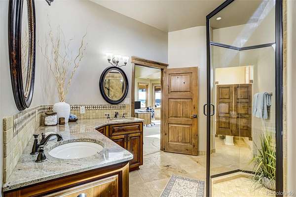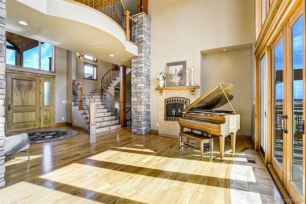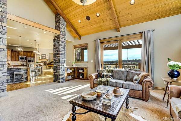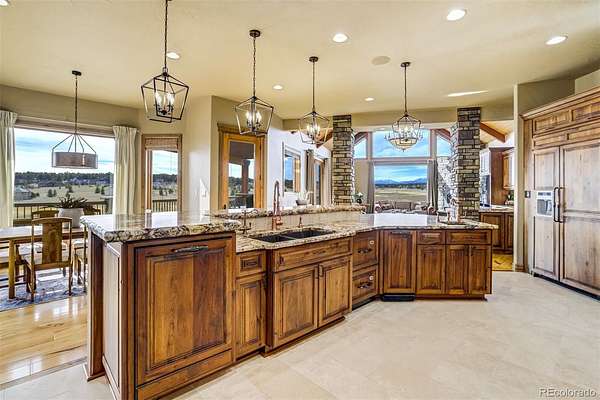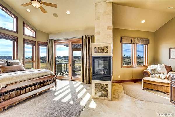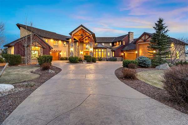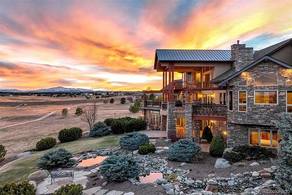 Set high above the fairways of Kings Deer Golf Club, where the land rolls wide and the horizon stretches from the Front Range to the bold rise of Pikes Peak, stands a home built for gathering, reflection, and the quiet luxury of Colorado living. On 2.52 acres in King’s Deer Highlands, this 10,248 sq. ft. custom estate carries the feel of a grand mountain lodge—warm, welcoming, and ready for generations to come. Sunlight pours through walls of windows, drawing the eye to mountain views and open sky while the great room’s soaring ceilings and stone fireplace create a natural place for stories, laughter, and evenings well spent. The main-level primary suite is a retreat of its own, with a three-sided fireplace, sitting room, coffee bar with wet sink, spacious bath, and private patio access—designed for comfort today and ease for years ahead. An elevator, ramp entry, and wide hallways support true aging-in-place living. Two private wings provide space and independence for extended family, guests, or caregivers, each with sitting areas and balconies that capture the sweeping landscape. Downstairs, the walk-out level invites gathering with a media and game lounge, wet bar, wine cellar, and fireplace—perfect for celebrations that last well into the evening. Waterfalls, a reflecting pond, firepit, and grotto-style spa create a setting for quiet mornings or unforgettable nights beneath Colorado’s expansive sky.