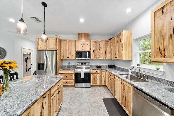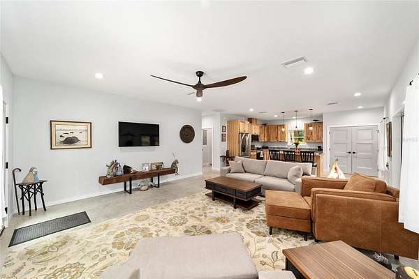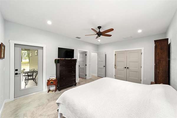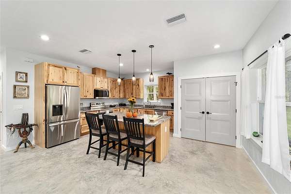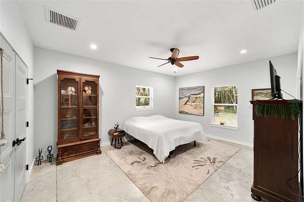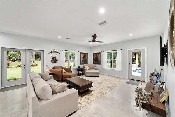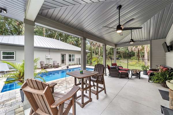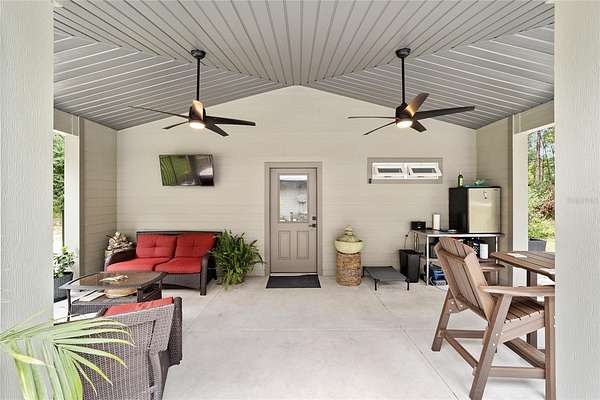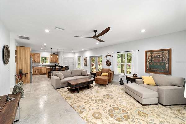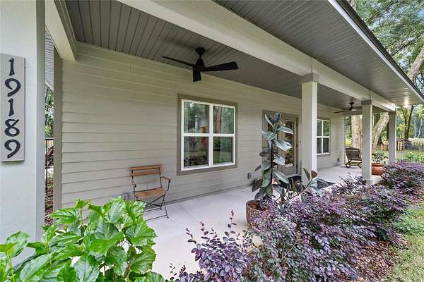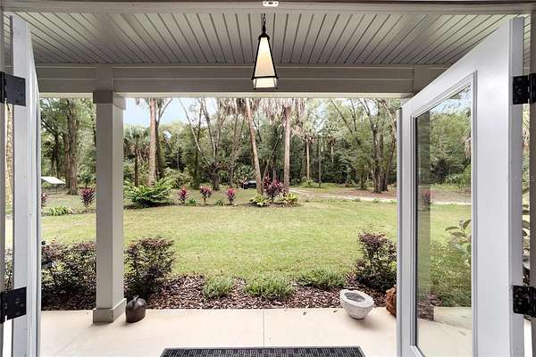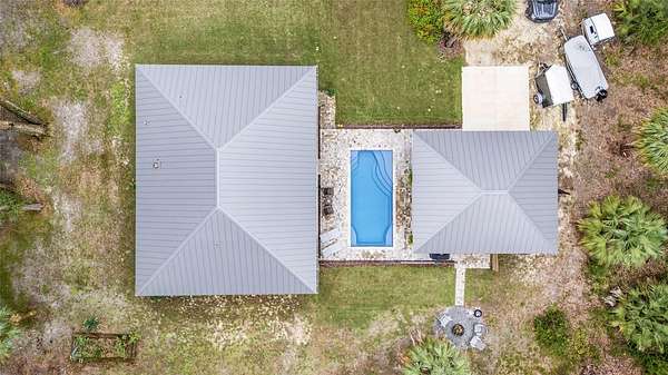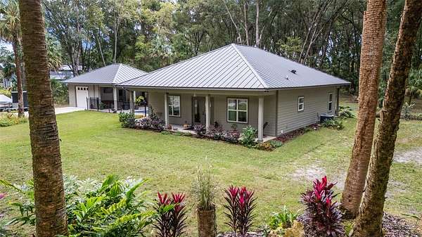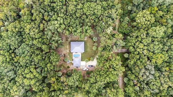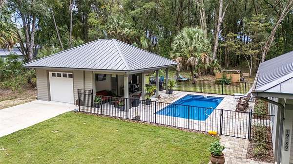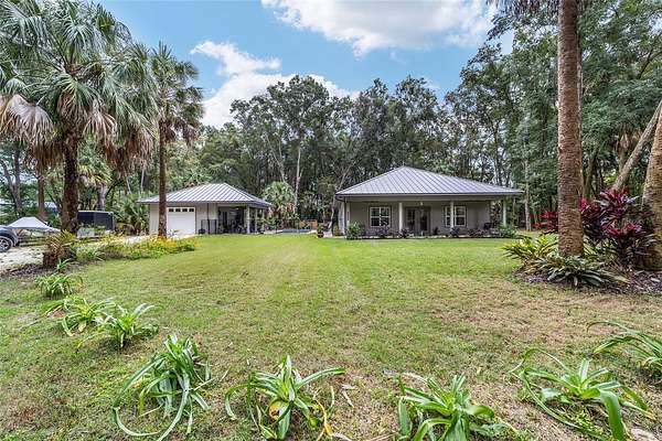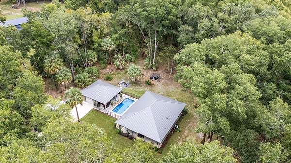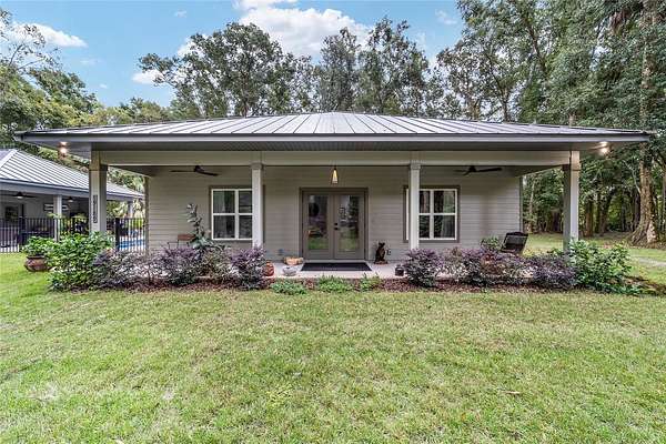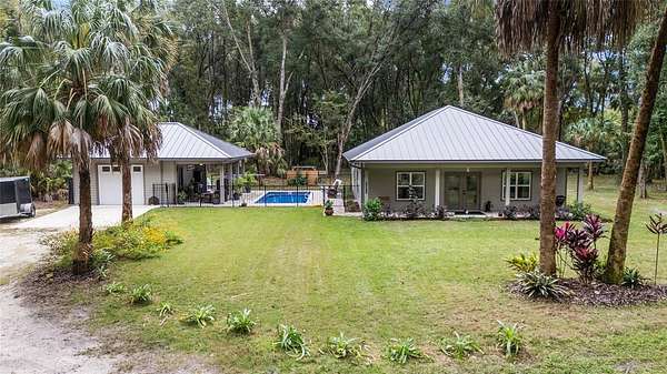 Under contract-accepting backup offers. Private 5.21 acre retreat with modern 2023 home and pool in Citra, Florida. Built in 2023, this 1,426 sq ft, 2-bedroom, 2-bath home sits on 5.21 acres. Step inside to an open-concept living area with 9-foot ceilings, sealed concrete floors and lots of natural light. The kitchen features beautiful hickory cabinetry, granite countertops and plenty of workspace for cooking and entertaining. The owner's suite includes an ensuite bath and a large walk-in closet. Down the hall, you'll find a second bedroom, guest bath, and two storage closets. Home has on-demand hot water. Enjoy the outdoors from the fenced paver patio complete with a heated and cooled, in-ground fiberglass saltwater pool, covered lounging area and outdoor shower. The one-car garage includes an attached bonus room that could serve as storage, a workshop or potential guest space. There's a separate studio to the right of the home, offering flexibility for a home office or craft space. Small fenced pasture with chicken coop. Built to withstand up to 150 mph winds, the home features a reinforced slab with anchors every foot. With a manicured yard and tranquil surroundings, this property offers privacy while still being conveniently located. Duke electric, Conexon Connect's internet. Bring your RV and or boat, just 5 minutes from Lake Lochloosa, 30 minutes to Gainesville, 25 minutes to Ocala, 30 minutes to Crystal River, one hour to the Golf of Mexico.