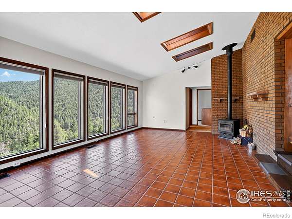 This unique 1,800 square foot house sits on 8.41 acres of land, offering breathtaking panoramic mountain views. The home features an open layout with hardwood floors in the kitchen and dining room and large windows that allow for an abundance of natural light. The property's exterior blends seamlessly with the greenery and mountainous terrain that surrounds the home. The spacious outdoor deck provides the perfect setting for enjoying the scenic views and star-filled night sky. Sunny, south-facing windows and central brick wall and tiled floor in living room act as integrated passive solar heating with wood stove and electric heat assist. With a 16 min drive to north Boulder (7.6 mi), no HOA, and privacy afforded by steep, sunny Nugget Hill Rd, you'll have your own mountain retreat while still being able to access the town.