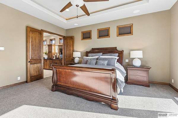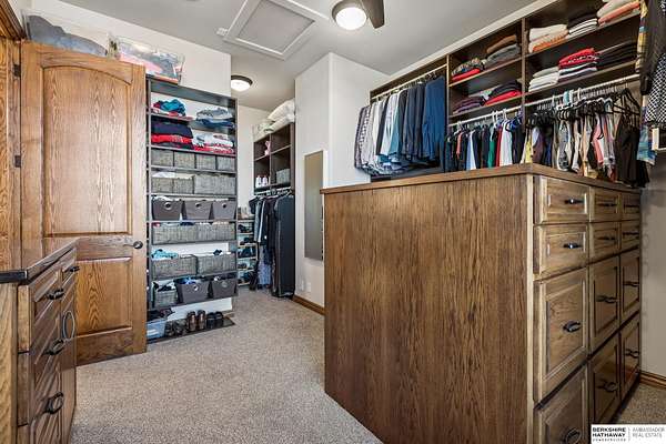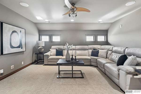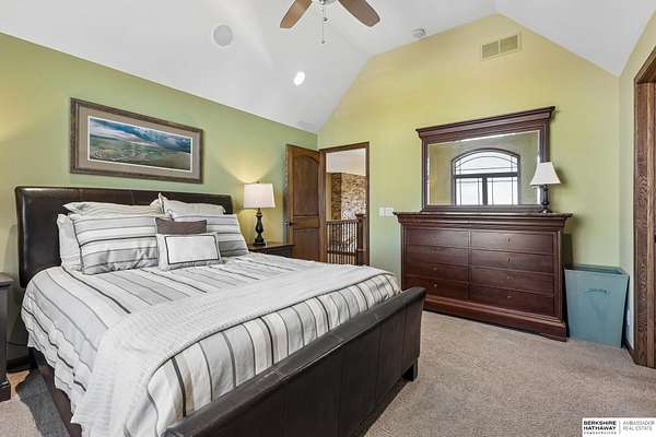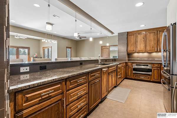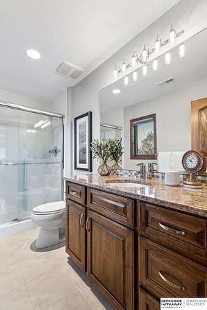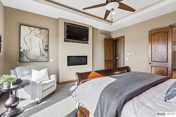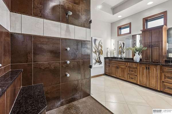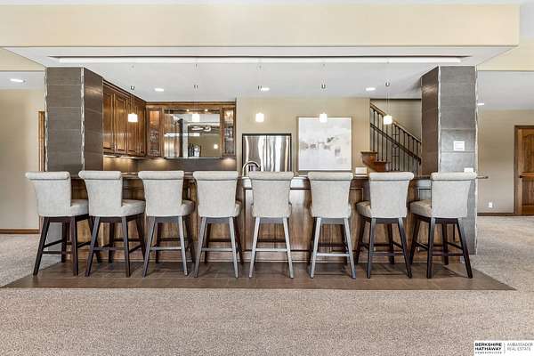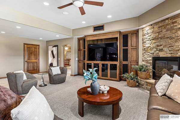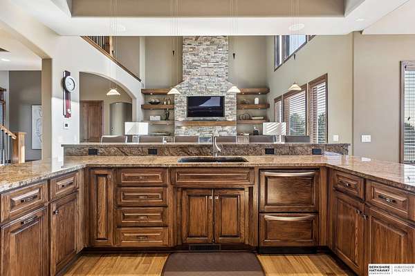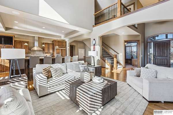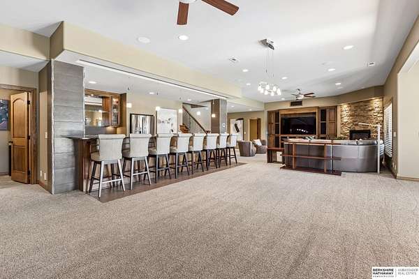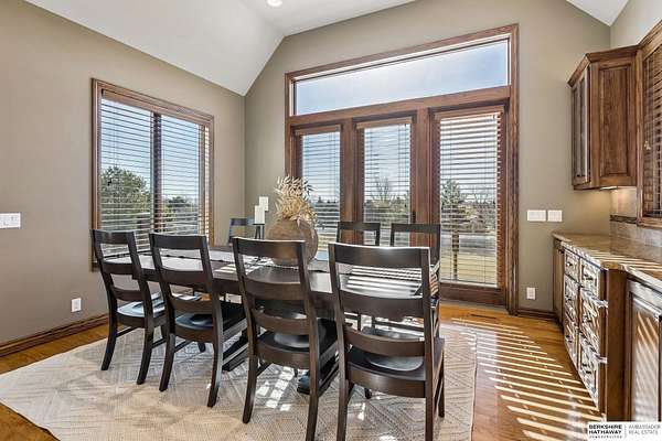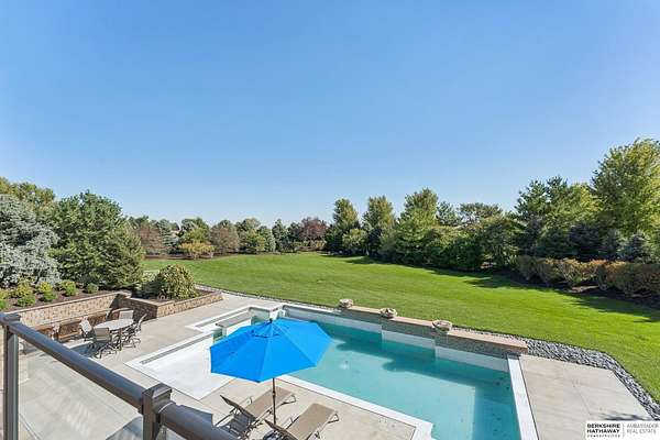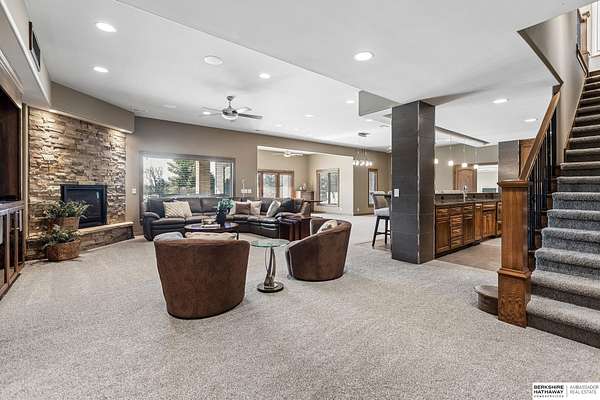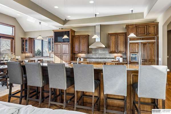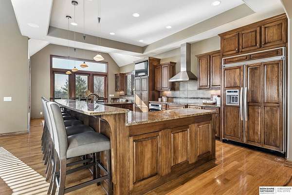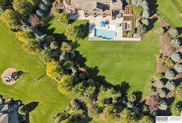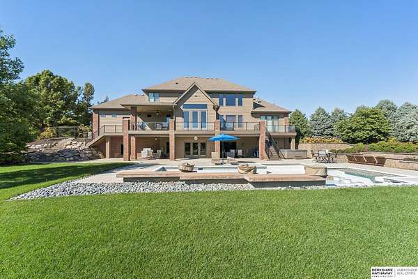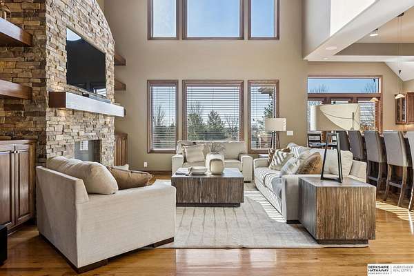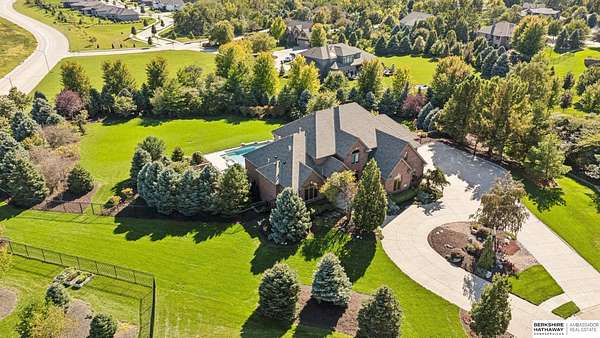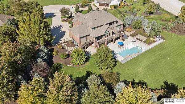 Deb Ellis, M: 402-706-1003, deb.ellis8@gmail.com, https://www.bhhsamb.com - Exceptional 1.5-story estate on 1.6 private acres offering 7,288 sq ft & an oversized 4-car heated garage. Dramatic two-story great room with natural stone fireplace & wall of windows overlooking resort-style grounds. Hickory hardwood floors, tray & soaring ceilings showcase quality craftsmanship. Gourmet kitchen with massive U-shaped Island, hidden walk-in pantry, double ovens, custom cabinetry, granite surfaces & premium appliances. Main-level primary suite with fireplace, sitting area, deck access, spa bath with multi-head shower & custom walk-in closet. The walkout lower level features an 18-ft granite bar, 3rd fireplace, versatile office & guest quarters. $500K+ backyard renovation includes 26x42 heated pool, fire bowls, composite deck, sunken fire pit, spa & 450+ mature trees with stunning landscaping & hardscape. See assoc. docs for additional features.