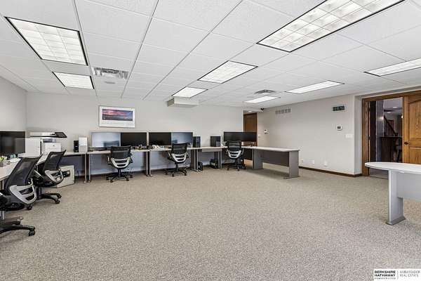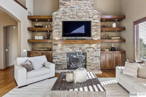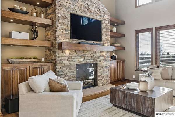 Deb Ellis, M: 402-706-1003, deb.ellis8@gmail.com, https://www.bhhsamb.com - Stunning 1.5-story estate on 1.6 private acres designed for ultimate outdoor living. Over $500K invested in a true resort-style backyard featuring a 26x42 heated pool, fire bowls, a sunken fire pit, spa, & expansive composite deck, perfect for entertaining or relaxing in total privacy. Surrounded by 450+ mature trees, the lush landscaping & custom hardscape create a secluded, park-like setting. Inside, 7,288 sq ft offers seamless indoor-outdoor flow w/dramatic 2 STY great room showcasing a wall of windows overlooking the backyard. Gourmet kitchen w/oversized U-shaped island, hidden walk-in pantry, double ovens, & premium finishes. Main-level primary suite w/fireplace, sitting area, spa bath, & direct deck access. Walkout LL includes an 18-ft granite bar, additional fireplace, office, & guest quarters. Spacious FlexCore-constructed bonus area beneath the garage w/private garage access & walkout, ideal for a gym