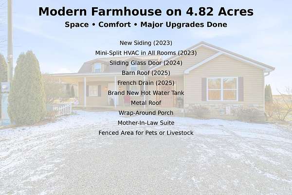 Welcome to country living the way it's meant to feel. Set on 4.82 acres, this 4-bedroom, 2.5-bath home offers the perfect blend of comfort, space, and simple living. Morning coffee on the porch, wide open skies, and room to garden, raise animals, or create your own homestead lifestyle it's all here. Inside, you'll find 2,147 square feet filled with natural light, vaulted ceilings, and an inviting layout. The first-level primary suite is offering privacy and flexibility. With its own adjoining bath and walk-in closet. A durable metal roof, energy efficient ductless mini-split system, and new water heater.Step outside and you'll find open acreage, two barns, fenced areas, and scenic surroundings that make this property ideal for animals, gardening, outdoor hobbies, or simply enjoying peaceful views and fresh air. If you've been searching for space, versatility, and a place that feels like home the moment you arrive, this property is ready to welcome you.