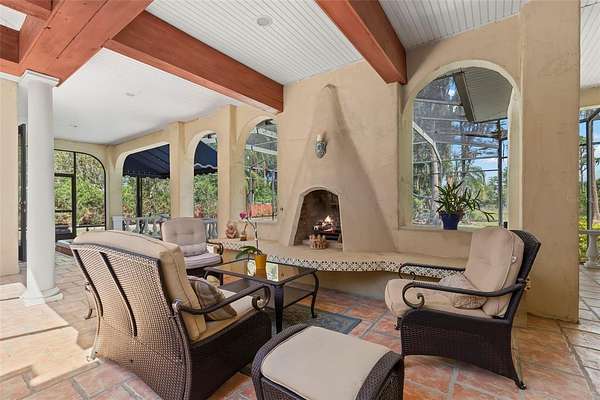 Outdoors, the home transitions effortlessly into a resort-like environment. A pool and spa, outdoor fireplace, and expansive wraparound terrace with fountain are oriented toward the water, offering an ideal setting for both entertaining and quiet reflection. The landscape is alive with native wildlife, from wading birds to otters along the shoreline, reinforcing the sense of retreat.