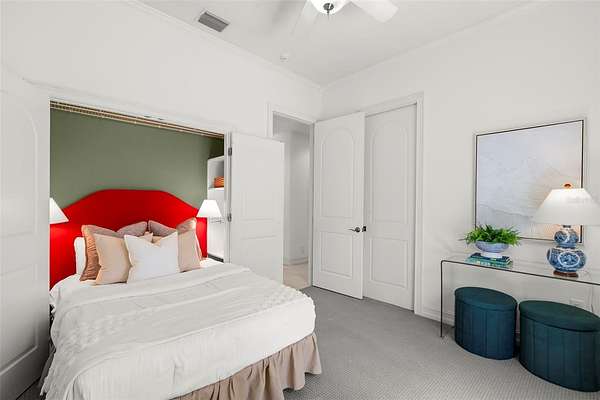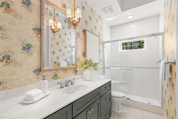 Spanning nearly 4,000 square feet, the home is composed with intention. The main-level primary suite opens directly to the outdoor living spaces, creating a natural flow between interior comfort and the lakefront setting. A spacious bath with dual vanities and a walk-in shower completes the retreat. The main level also includes a formal dining room, a dedicated office, and a guest bedroom with full bath, providing both functionality and flexibility.