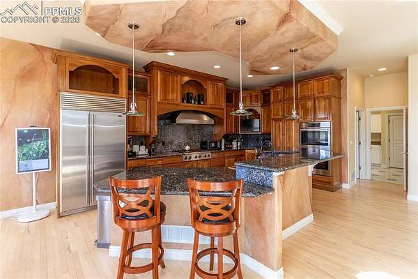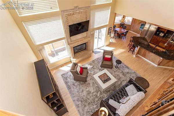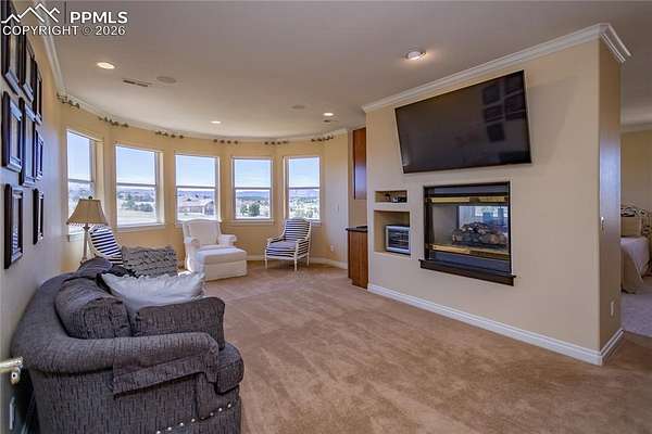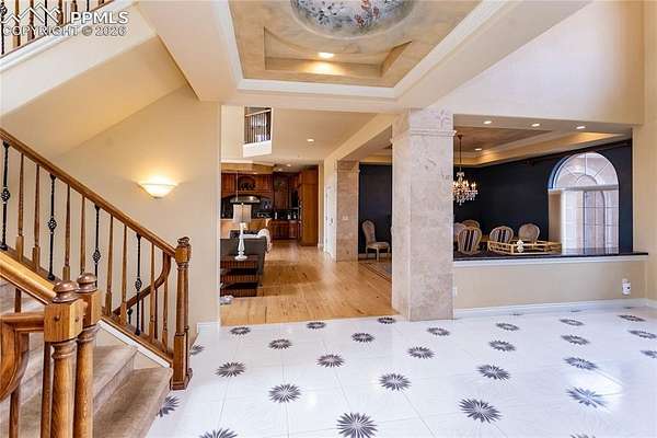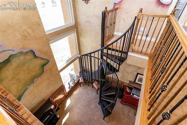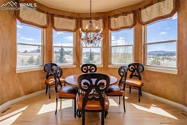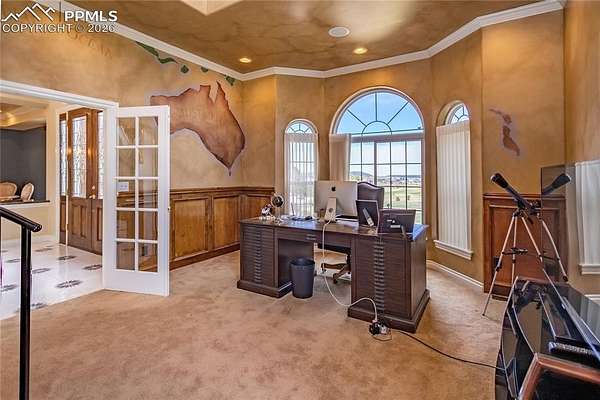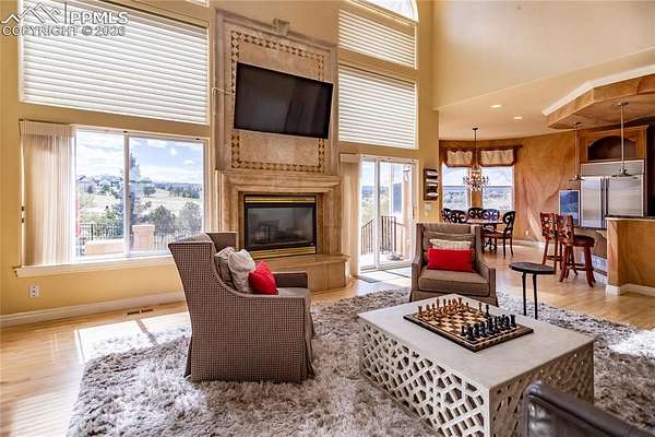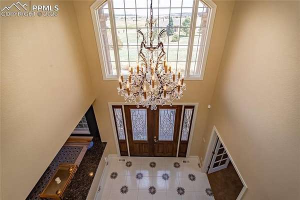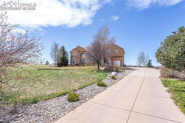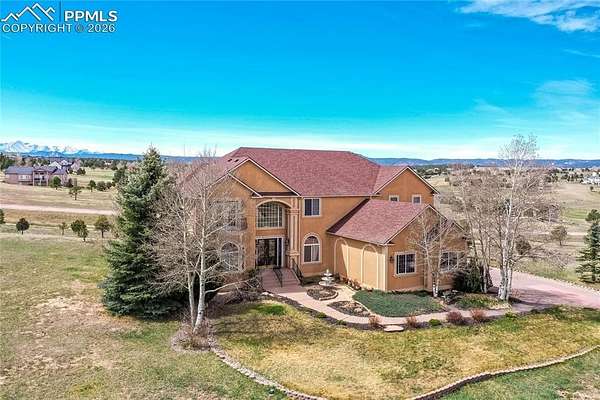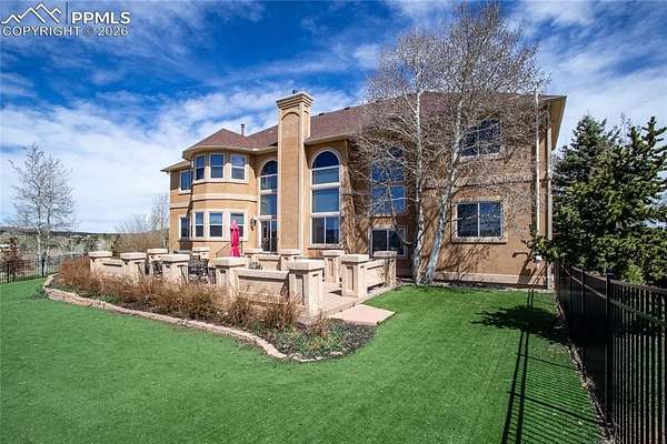 This former award-winning Parade of Homes property offers exceptional design, luxury finishes, and breathtaking views. Situated on 2.5 acres, the property provides the space, privacy, and tranquility expected in a premier estate setting. Enter through the grand double-door entry into an impressive open living space featuring custom tile work and elegant architectural details. The main level includes a private office with a spiral staircase leading to a library above, perfectly positioned to capture beautiful views of Kings Deer Golf Course. The luxurious primary suite features a sitting area, fireplace, wet bar, an expansive walk-in closet, and a spa-inspired primary bath. An elevator with access to all three levels adds convenience and accessibility throughout the home. The kitchen is designed for both everyday living and entertaining with Bosch appliances, double ovens, abundant cabinetry, and a hidden cabinet entry to a massive walk-in pantry. The kitchen opens seamlessly to the main living area. Enjoy incredible scenery from every direction. The front sitting area overlooks Kings Deer Golf Course, while the back patio offers stunning views of the Front Range and Pikes Peak. The fenced backyard features recently installed artificial turf, creating a beautiful low-maintenance outdoor retreat. Both outdoor spaces provide a peaceful and private setting ideal for relaxing or entertaining. The finished basement offers a spacious family room with a wet bar and a dedicated workout/exercise room, perfect for recreation and gatherings. This remarkable home combines luxury, privacy, and spectacular Colorado views in an unforgettable setting.