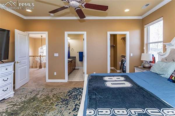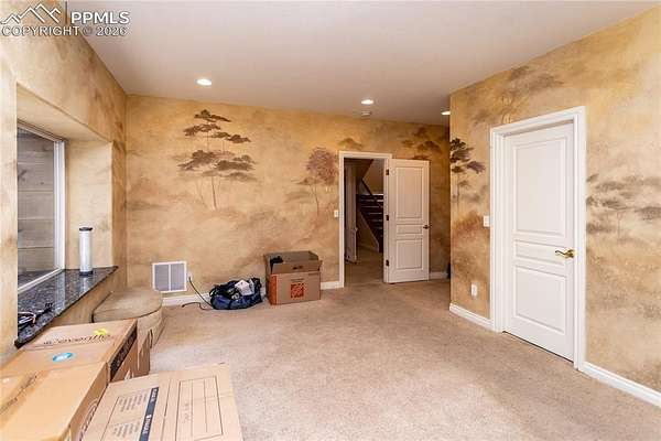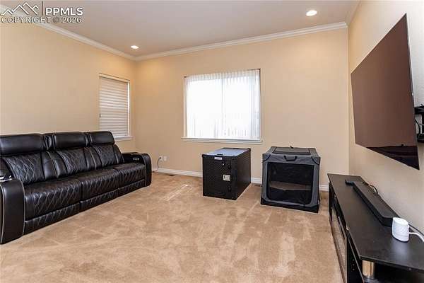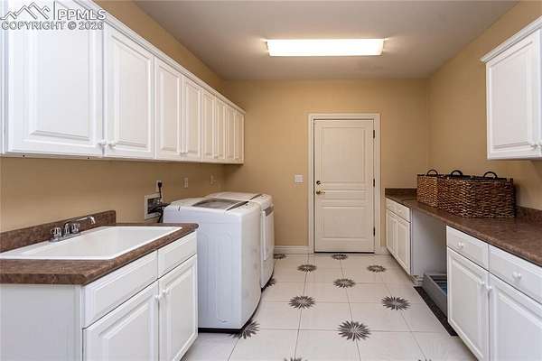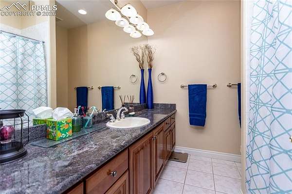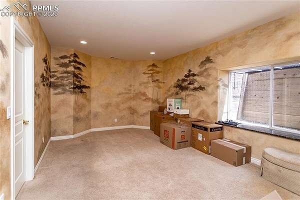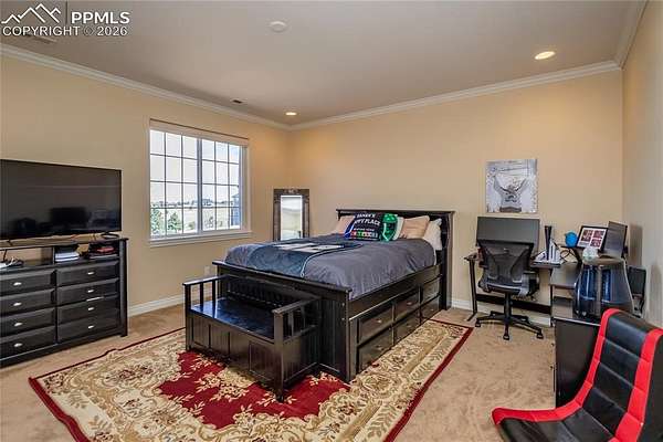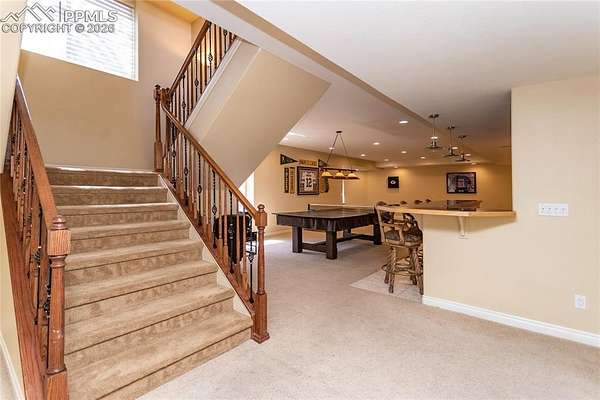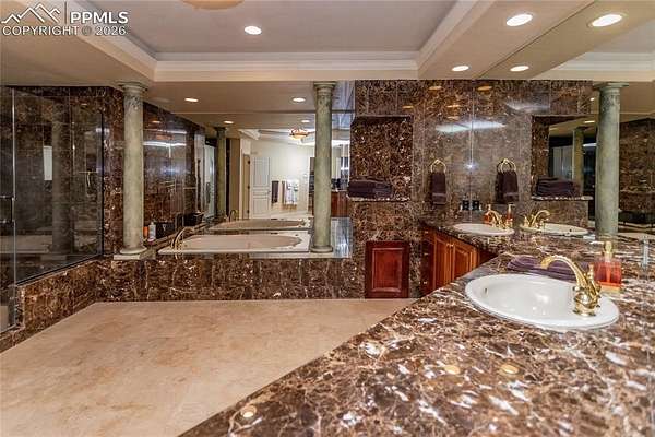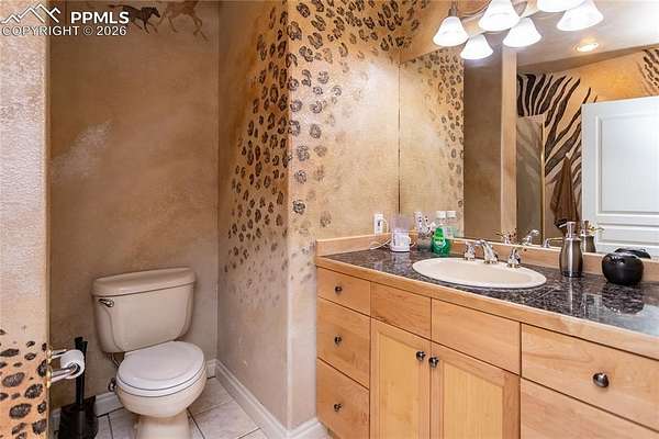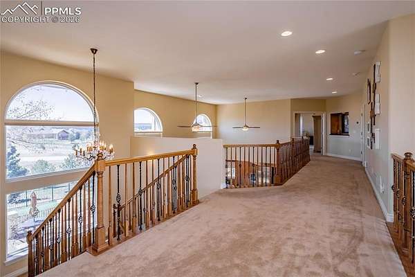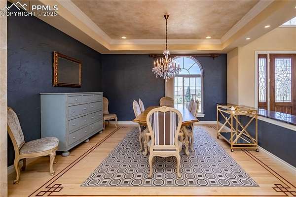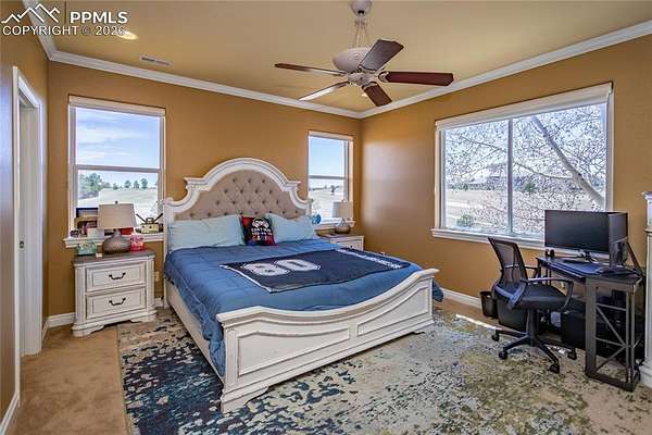 This former award-winning Parade of Homes property offers exceptional design, luxury finishes, and breathtaking views. Situated on 2.5 acres, the property provides the space, privacy, and tranquility expected in a premier estate setting. Enter through the grand double-door entry into an impressive open living space featuring custom tile work and elegant architectural details. The main level includes a private office with a spiral staircase leading to a library above, perfectly positioned to capture beautiful views of Kings Deer Golf Course. The luxurious primary suite features a sitting area, fireplace, wet bar, an expansive walk-in closet, and a spa-inspired primary bath. An elevator with access to all three levels adds convenience and accessibility throughout the home. The kitchen is designed for both everyday living and entertaining with Bosch appliances, double ovens, abundant cabinetry, and a hidden cabinet entry to a massive walk-in pantry. The kitchen opens seamlessly to the main living area. Enjoy incredible scenery from every direction. The front sitting area overlooks Kings Deer Golf Course, while the back patio offers stunning views of the Front Range and Pikes Peak. The fenced backyard features recently installed artificial turf, creating a beautiful low-maintenance outdoor retreat. Both outdoor spaces provide a peaceful and private setting ideal for relaxing or entertaining. The finished basement offers a spacious family room with a wet bar and a dedicated workout/exercise room, perfect for recreation and gatherings. This remarkable home combines luxury, privacy, and spectacular Colorado views in an unforgettable setting.
