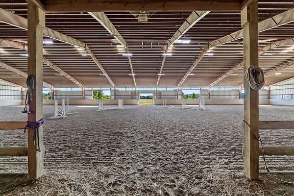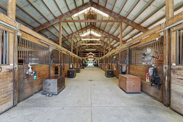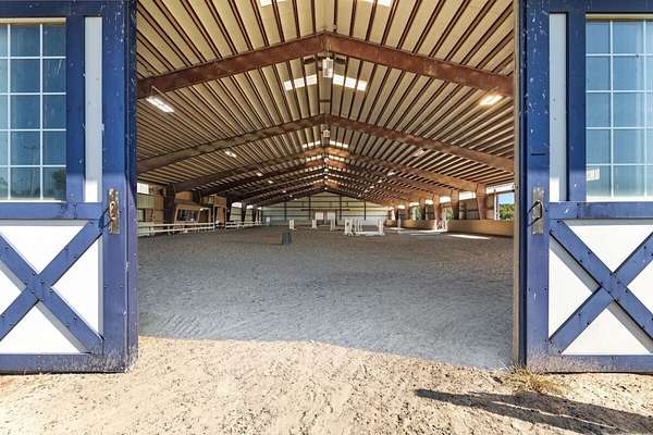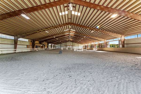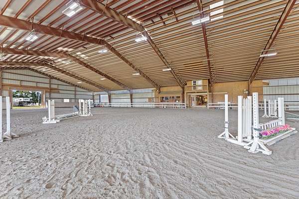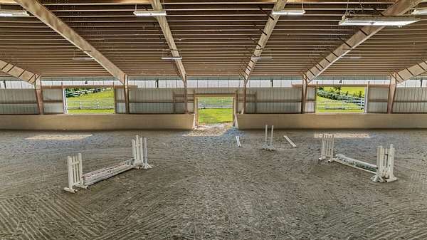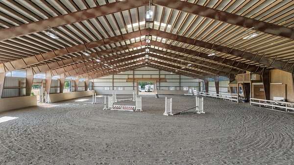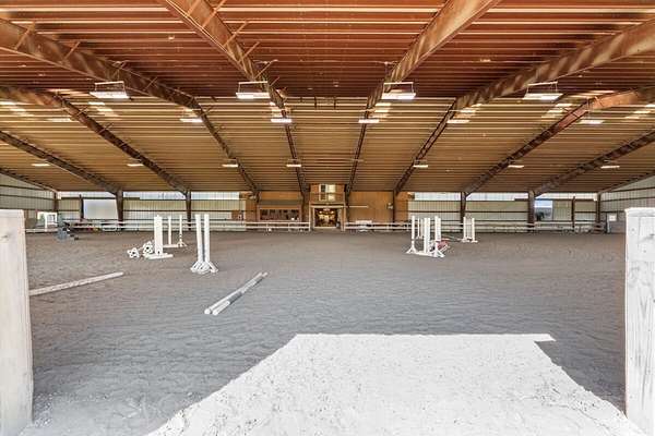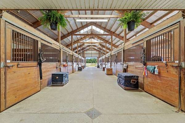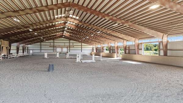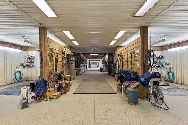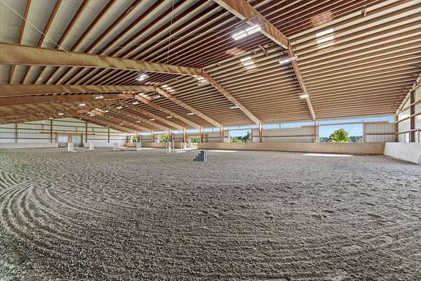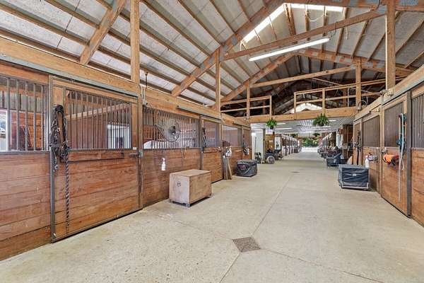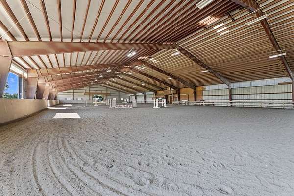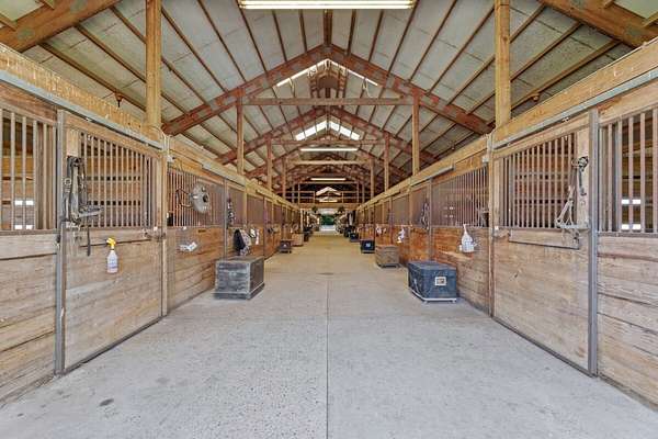 - 42 fully equipped stalls, including oversized 12'x12' with mats and automatic waterers, pony stalls, and additional wash stalls with hot/cold water and overhead heaters.