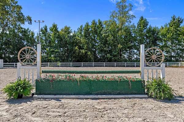- Multiple outdoor arenas, including a lighted 140' x 280' ring with judges stand and jumps, plus a 150' x 300' front ring (convertible to paddocks).