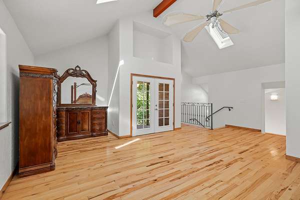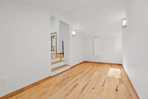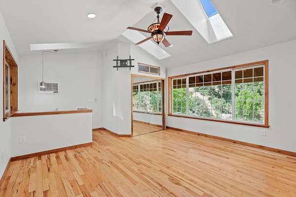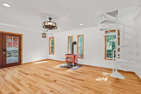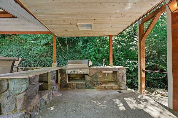 The home features two comfortable bedrooms with balconies overlooking the forested grounds, plus an oversized bonus room that could easily be converted into a bunk room, perfect for hosting large groups. The home has a sense of warmth from the soft toned real wood flooring all the way to the wood burning stove in the living room. The kitchen continues the warm and inviting feeling with the well-appointed granite slab counters and high-end appliances.