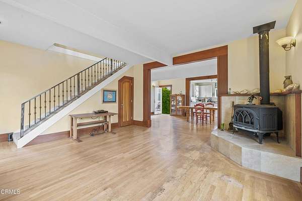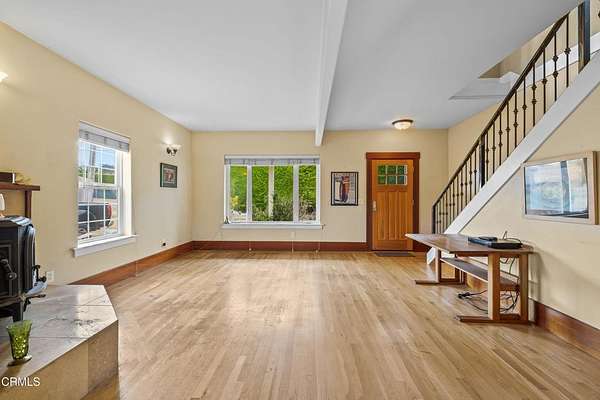 Set on seven acres in Manchester, this home offers space, light, and a quiet connection to the Mendocino coast. The main floor features hardwood floors and fireplace in the dining and family rooms, with a kitchen centered around an island designed for cooking and entertaining. Upstairs, two bedrooms and two bathrooms provide comfort and functionality, while an office and balcony open to panoramic views of the Pacific. The property includes established fruit trees and room for additional gardening or landscaping, creating a setting that blends practicality with natural beauty. With ocean views, open land, and a home designed for gathering and reflection, this property offers an inviting place to enjoy the rhythm of coastal living.