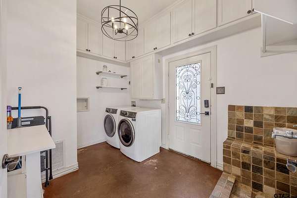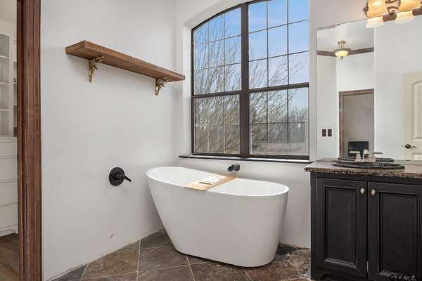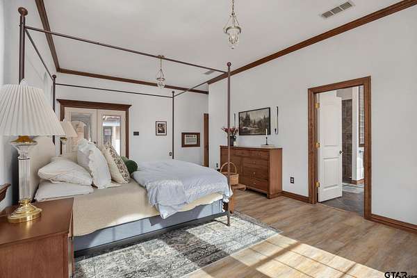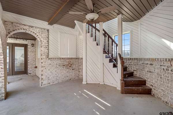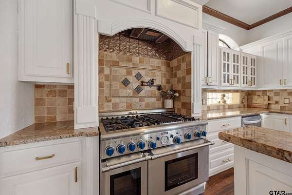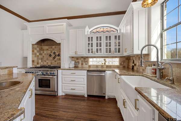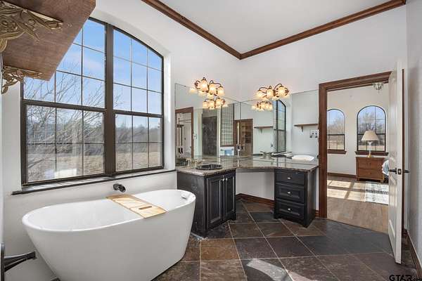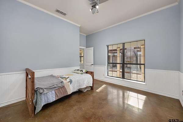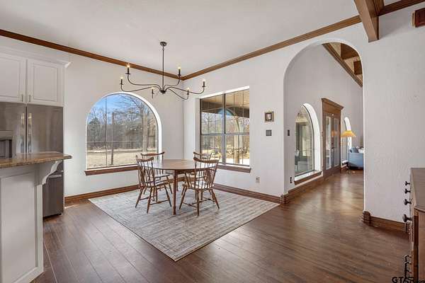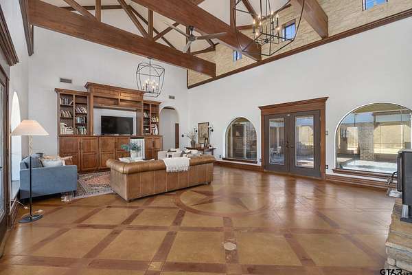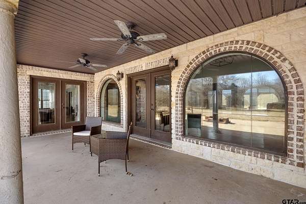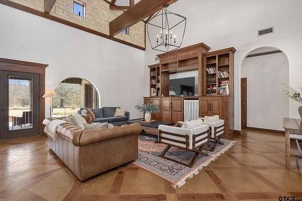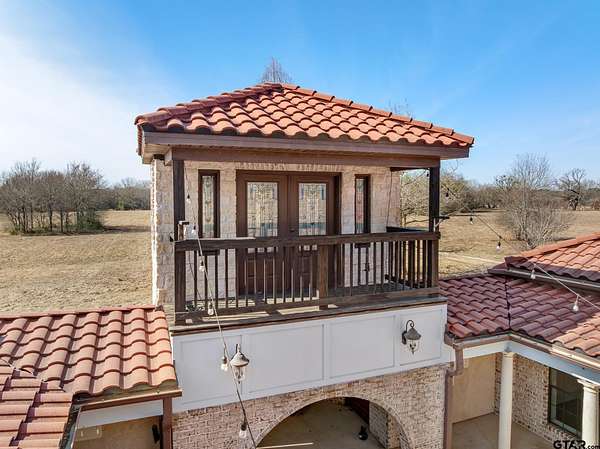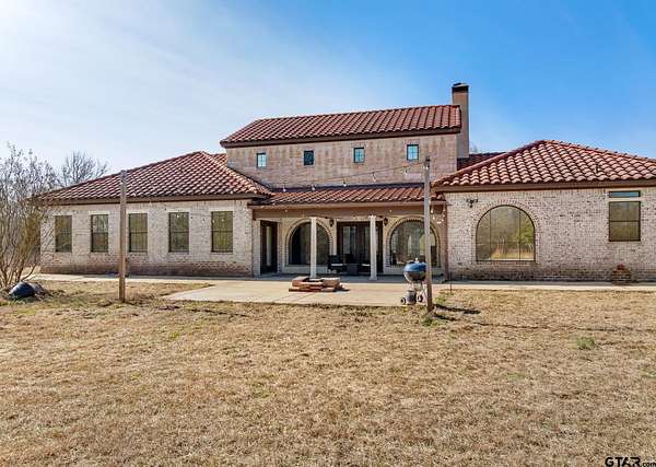 This stunning East Texas estate rests on a serene 19-acre setting, offering privacy, beauty, and timeless style. The acreage is flat, level and buildable, with a nice mix of pasture and woods. Enjoy peaceful lake views and a portion of Bagley Lake to fish or play in. The upscale Mediterranean-Spanish inspired home features a classic tile roof and a tranquil private courtyard complete with an outdoor stone gas fireplace, perfect for relaxing or entertaining. Inside, the great room impresses with soaring wood-beam cathedral ceilings, a custom stone accent wall, and an additional fireplace. Unique arched windows fill the home with natural light and architectural character. The kitchen is thoughtfully designed with a distinctive butler's pantry, gas Thermador cooktop and double ovens, and a casual dining area. The luxurious primary suite offers private access to the courtyard, creating a peaceful retreat. A quiet office and three additional bedrooms provide ample space for work, guests, or recreation. This is one property you have to see in person...schedule a showing to experience it for yourself!