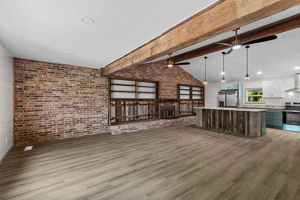 - Beamed Ceilings, Breakfast Bar, Built-In Features, Cathedral Ceiling(s), Ceiling Fan(s), Eat-In Kitchen, Granite Counters, High Ceilings, High Speed Internet, Kitchen Island, Natural Woodwork, Pantry, Recessed Lighting, Smart Thermostat, Stone Counters