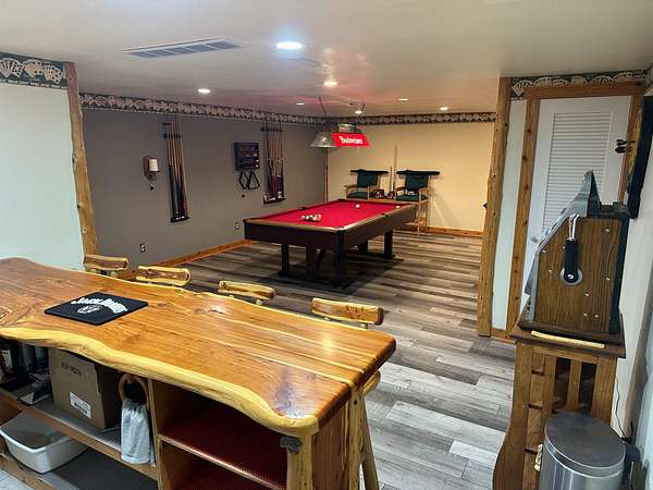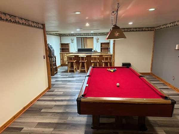 Designed for entertaining, the home features a custom cedar bar and lounge in the basement as well as a party dock on the pond--perfect gathering spaces for family and friends.