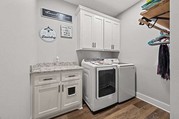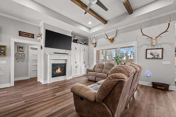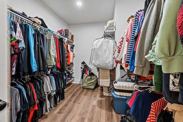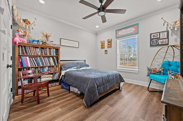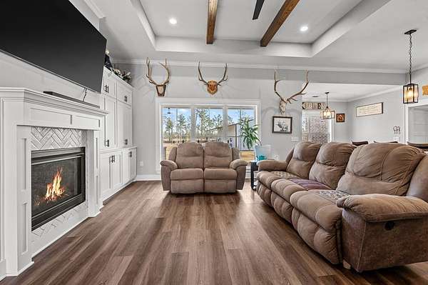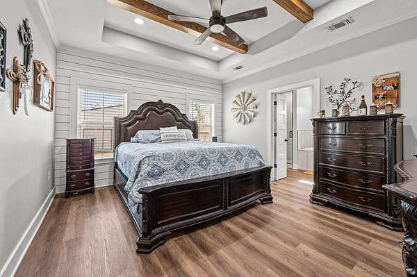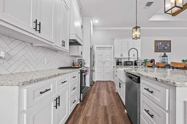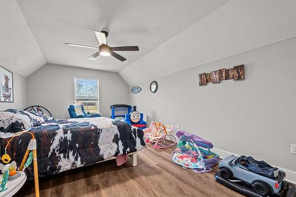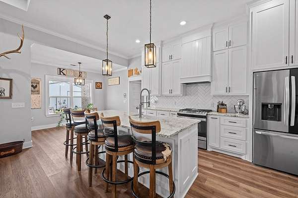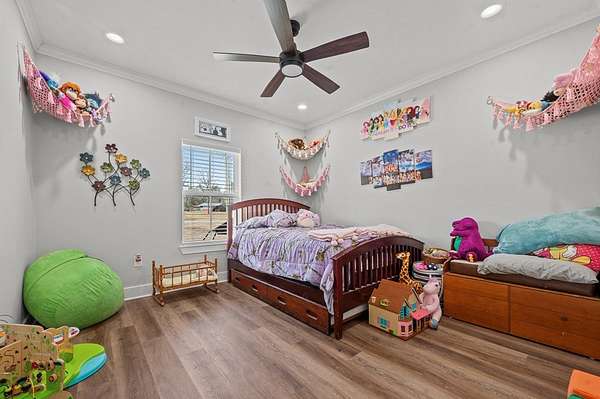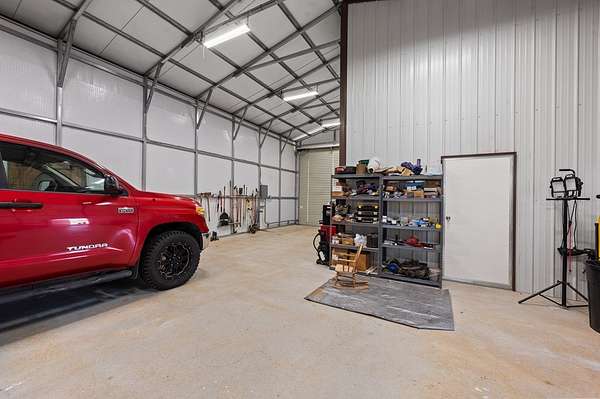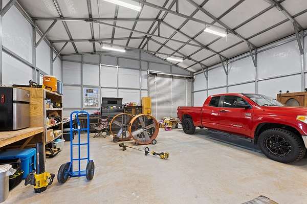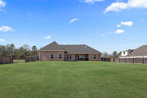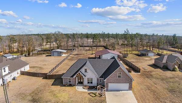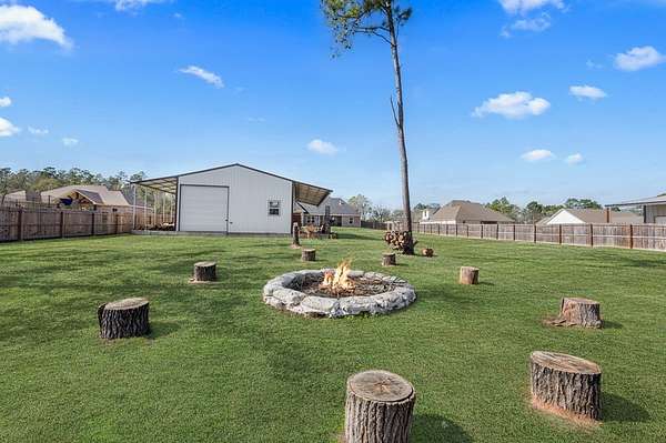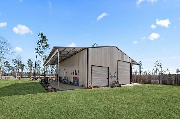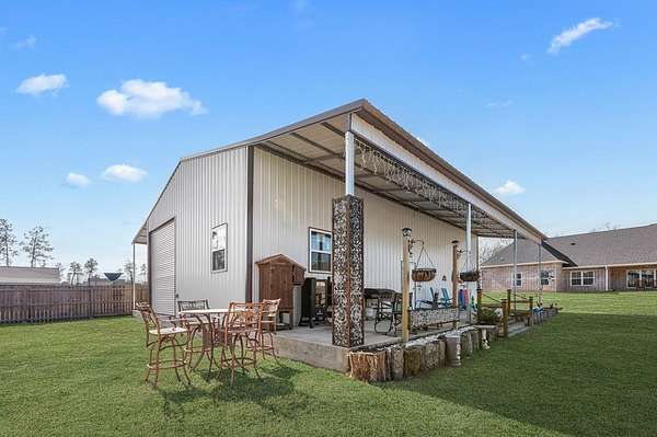This show-stopper 5-bed 2-bath home offers space, function, and a layout designed with intention. Raised ceilings and abundant natural light create an open, airy feel, while the oversized front doors provide a true grand entrance the moment you step inside. The kitchen anchors the home with a large island, farmhouse sink, generous cabinetry, and seamless flow into the main living areas - ideal for everyday living and entertaining. Storage is thoughtfully planned throughout, including ample closets and additional attic space. One bedroom is located upstairs, offering a private retreat perfect for a teenager, guest room, office, or flexible bonus space. The fully fenced backyard is built for both enjoyment and functionality, featuring a fire pit area and a shop on a slab with electricity. The shop includes pull-through roll-up doors and lean-tos on each side, making it ideal for storage, projects, or recreational use. Designed with intention and built for living!