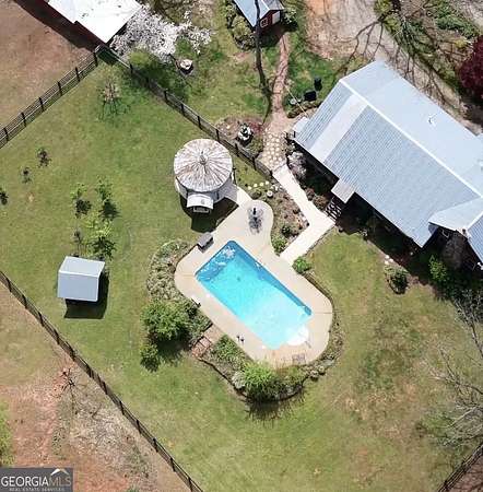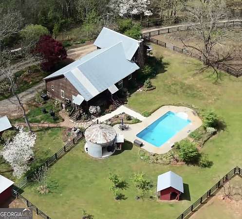 Own a true piece of history-this stunning 1873 cabin blends timeless craftsmanship with modern comfort on 7.32 beautiful acres. Featuring over 2,700 square feet, the home offers 3 bedrooms, 2.5 baths, soaring vaulted ceilings, and exposed sapling rafters that make a lasting impression. The thoughtfully designed addition preserves the home's original charm while enhancing everyday living. Enjoy a spacious dining area, inviting living room with a stone fireplace sourced from the property, and a beautifully appointed kitchen with a large island, gas cooktop, double ovens, and a Sub-Zero refrigerator. The private owner's suite opens to a screened porch overlooking a saltwater pool and lush gardens, while upstairs, a versatile loft adds flexible space. Throughout the home, you'll find original details like wide-plank flooring, antique doors, and stained-glass windows. Outside, the property is just as remarkable-featuring mature pecan trees, a refreshed barn with stables, fenced pastures, and multiple outbuildings including coops and an aviary. Extensive upgrades include new windows, updated systems, a 3-car garage, pavilion, and more. This is more than a home-it's an experience you have to see in person.
