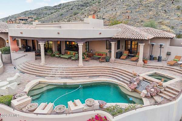 Magnificent mountain luxury retreat. Experience refined tranquility in exclusive, gated enclave of Tapestry Canyon. Striking first impression. Unparalleled craftsmanship. Dramatic entry opens to sophisticated interior with hickory hardwood floors, custom lighting, knotty pine doors. Every detail thoughtfully curated. Gourmet kitchen offers breakfast room, full butler's pantry with second fridge. Inviting family room showcases built-in entertainment center, fully equipped bar with sink, fridge, granite counters. Two executive offices with custom built-ins. Four gas fireplaces create comfort and charm. Oversized 3-car garage. Resort-caliber setting designed to capture incredible mountain views: sparkling pool, spa, outdoor kitchen, multiple patios create quintessential estate luxury living. Additional Features & Amenities: * Elevator access from the garage to the main living level * Four spacious bedrooms, each with walk-in closets * Four and one-half beautifully appointed bathrooms * Custom cabinetry in the powder room * Expansive primary suite with dual walk-in closets and built-ins * Lower-level media/exercise room with Peloton treadmill and bike * Spacious laundry room with front-load washer and dryer, sink, and ample counter space * Furniture-grade cabinetry throughout the home * Multiple patios offering unobstructed mountain and desert views * Located within the award-winning Kyrene Elementary and Tempe Union High School Districts * Immediate access to hiking and mountain biking trails * Close proximity to shopping, golf, and Sky Harbor International Airport This extraordinary residence is a vision brought to life - a rare opportunity to enjoy estate-style living in a private mountain sanctuary that embodies elegance, serenity, and enduring luxury.