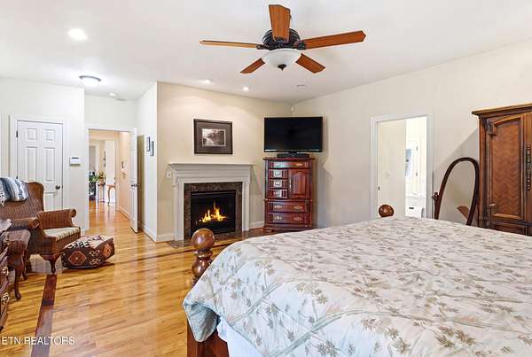 The main-level primary suite is a true retreat, showcasing the same beautiful walnut inlay detail, a cozy gas fireplace, private access to the rear deck, and a seamless connection to a dedicated office space. The ensuite bath offers dual walk-in closets, dual vanities, and a spa-like layout with a jetted tub and a separate custom-tiled shower that stands out as its own beautifully finished space.