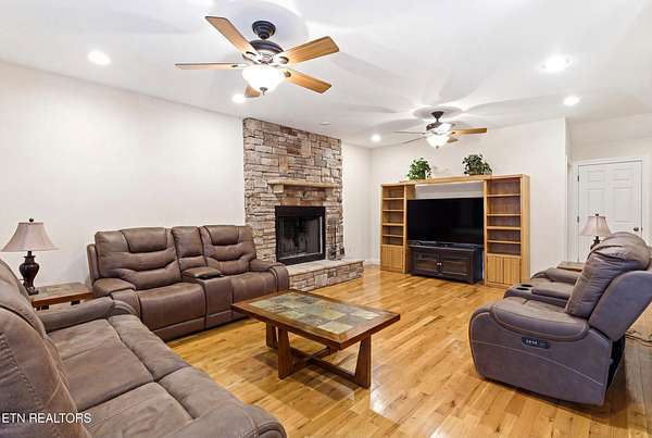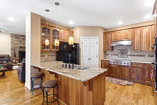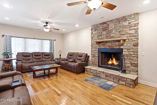 The formal living room and dining area are thoughtfully positioned for gatherings, with the living room featuring a cozy gas fireplace that enhances the space with warmth and character. The kitchen showcases natural cherry Craft-Made cabinetry, Kenmore Elite stainless steel appliances, and flows seamlessly into the breakfast nook and main living area. The primary living room is anchored by a wood-burning stacked stone fireplace and offers direct access to the rear deck and patio, creating an ideal space for entertaining or everyday living.