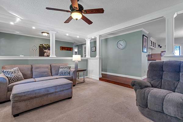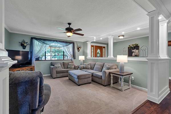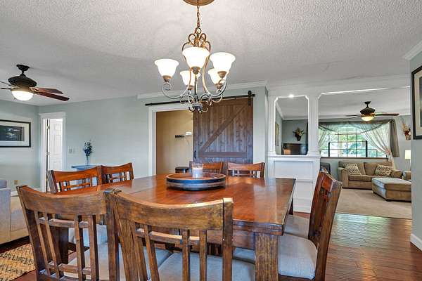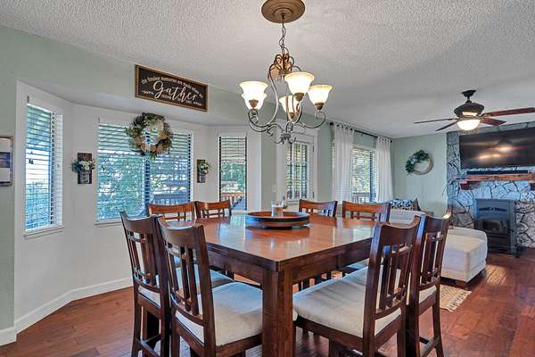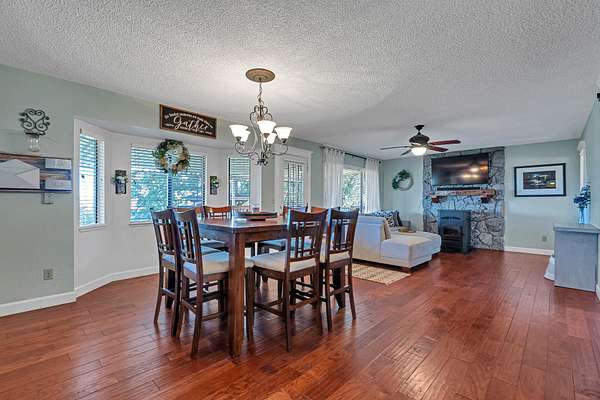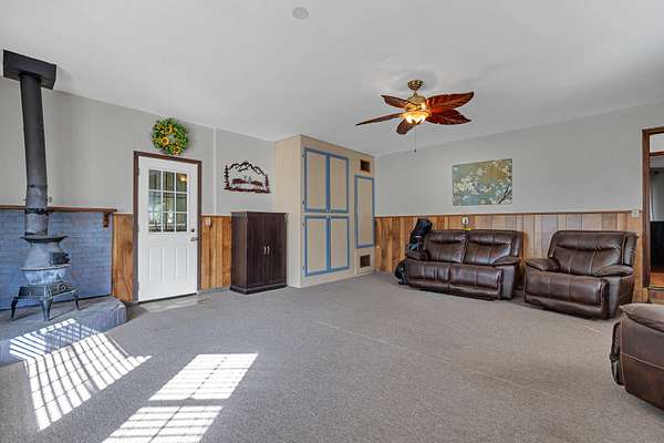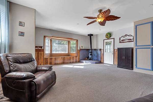 Inside, you'll find a thoughtfully designed layout featuring two inviting living rooms, large bedrooms, and an additional spacious recreation room with a cozy wood stove, providing plenty of space for gatherings, hobbies, or relaxing nights in. The expansive kitchen offers ample room for cooking and entertaining, while the home's brand-new HVAC system ensures year-round comfort.