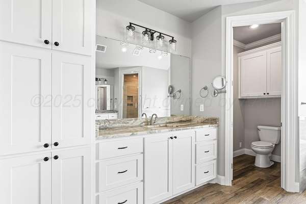 Get a CANYON VIEW with this immaculate Legacy Ranch home! One of the many additions made by the seller, on top of the 7,000 square ft of sod, sprinklers, screened in back patio and fire pit, is the privacy fence added down the sides of the large backyard and a wrought iron fence across the back to enjoy your view from home. Inside you'll appreciate the rich wood-look floors, beautiful granite, natural light & vast floorpan, all on one level. With large closets, ample storage, 5 generously sized rooms, plus an office or den with a walk-in closet that could be used as another (6th) bedroom. Your primary bedroom, bathroom and closet are large and have all the space and storage you could want with your primary closet providing access directly to your utility room. This home has it all!