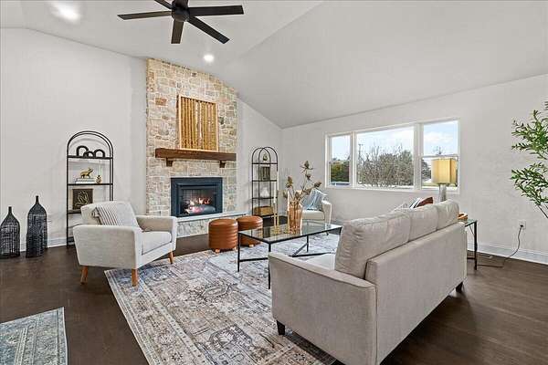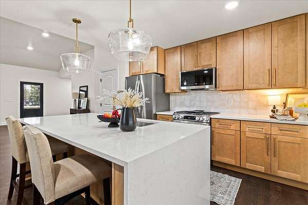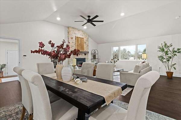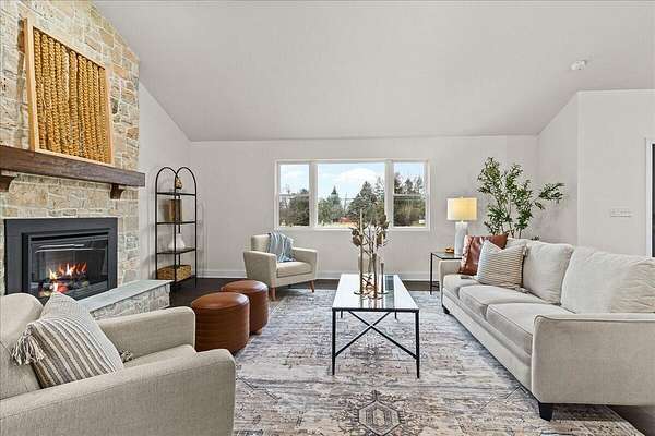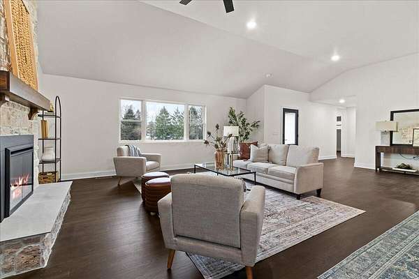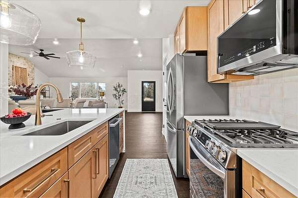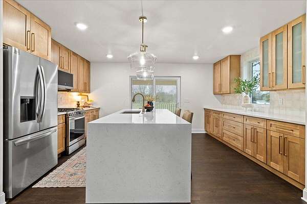 Est $3,753/moOPEN HOUSE Sunday December 21 from 12-2pm....This sprawling ranch home has been updated starting with an addition to include a dream kitchen with custom cabinets, an 8 foot water fall island for preparing meals or gathering with family and friends. Also added to the home is a primary suite with a large walk in closet. The home offers 2 additional bedrooms a large full basement and a flex space with it's own entrance for office or just an additional living space. The home has an oversized garage a custom built deck with vaulted ceiling to overlook the almost 2 acres of open land. Relax in the vaulted living room with a spectacular fireplace.