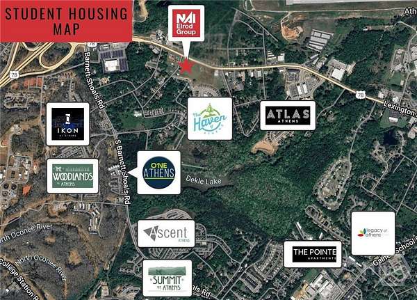 Property Description: Fantastic 2.78-acre Development Opportunity! This parcel has dual access to Lexington Road and Indiana Avenue, offering incredible exposure and accessibility. Whether you're a developer or an investor, this is an excellent opportunity you don't want to miss. With relatively level terrain, excellent visibility, and a traffic count of 28,400 cars, it's an ideal location for a new commercial/mixed-use development. This property is just two miles from downtown Athens and the University of Georgia and is under half a mile from the Highway 78 & Loop 10 interchange. This area continues to grow steadily with several new multi-family developments, including The Haven of Athens and the 1,000-bedroom Atlas Athens development. Currently, two small residential houses are on the property. This property is zoned Commercial General (CG), allowing for a wide range of commercial uses, and has all utilities available. Location Description: This parcel is located at the corner of Lexington Road and Indiana Avenue. Just two miles from downtown Athens and the University of Georgia, this property offers easy access to a vibrant community and a thriving student population. Less than a mile from the Bypass/Loop 10, the site makes it easy to access from anywhere in the Athens area. You can't beat the combination of location, visibility, and traffic count this site offers.