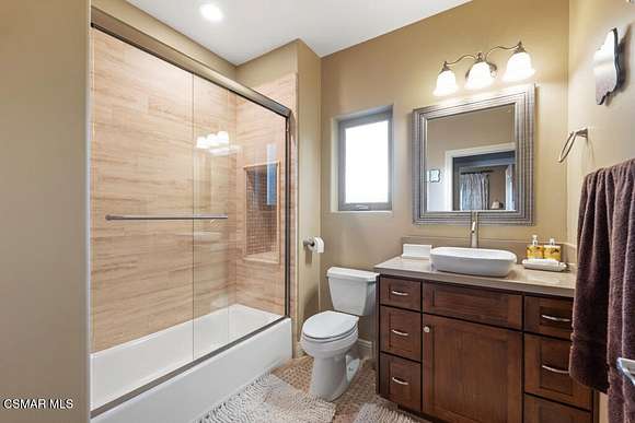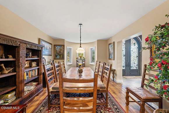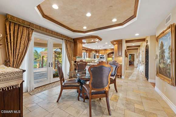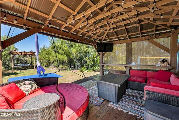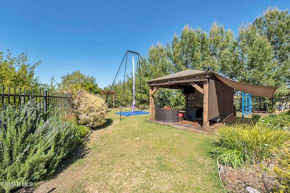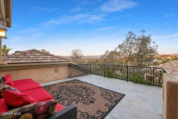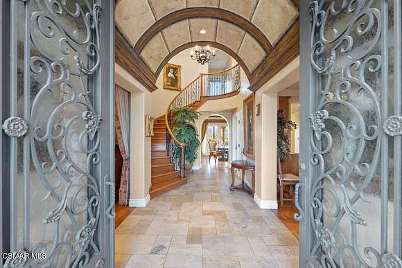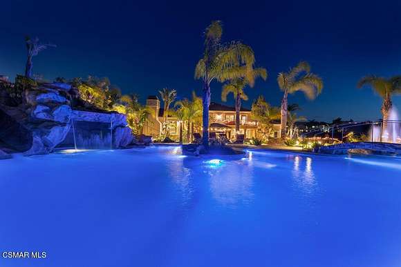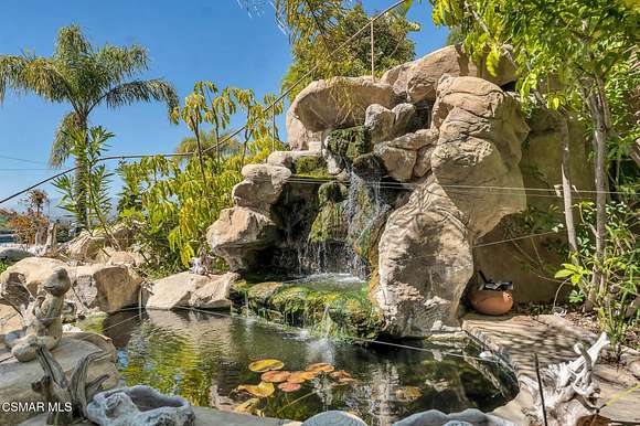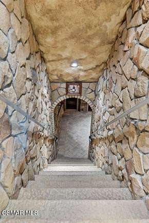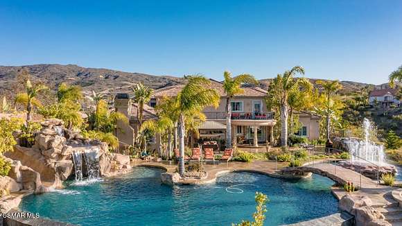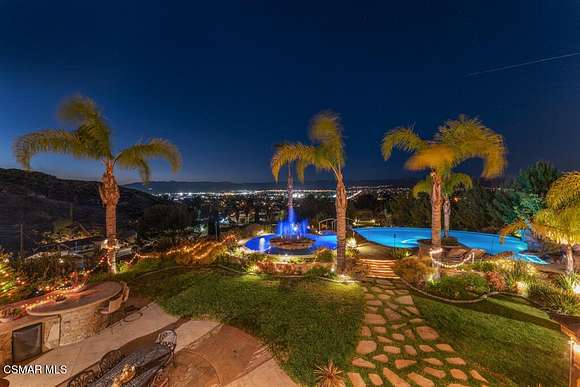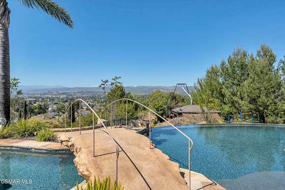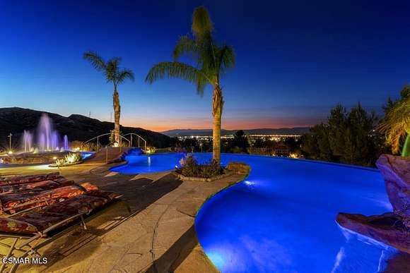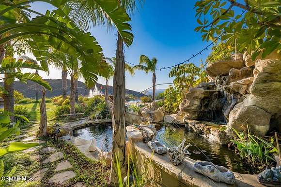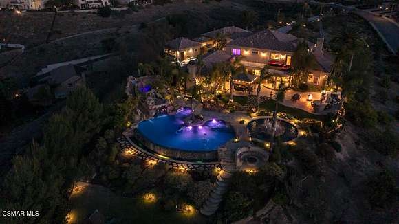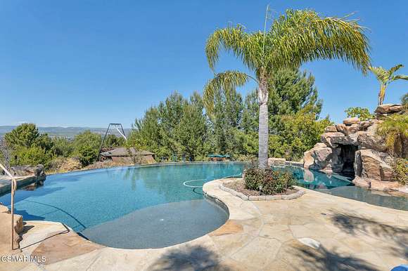 A hidden sanctuary on a hilltop in Southwest Simi Valley, this thoughtfully designed custom-built Mediterranean style home on 3.8 acres offers 360 degree breath taking views. Big backyard with duel level Koi pound has waterfall with living turtles, entertaining areas which include Infinity Pebble Tec pool with Baja shelfs and multicolor changing lights, rock waterfall with underneath grotto, fountain, slide, private spa, stone-surround fire pit, the outdoor kitchen, RV access, hillside avocado and various fruit orchard, kids playground, sports ground, vegetable garden, own solar system on the slope with capacity 29967 KW per year. Seller has architectural plans for well drilling with connection to the whole water system on the property. This amazing estate of a total 7,429.5 SqFeet living space includes 5,326 sq ft main house with 4 bds and 3,5 ba and 2 view balconies; 1,202.5 sq ft guest house with 2 bedroom, 2 bathrooms, living room, granite fireplace, and a balcony built in 2017; 484.5 sq ft wellness center house with cedar sauna, steam room, infrared sauna, large resting room with massage tables built in 2014; 112 sq ft playhouse with with retractable staircase to the capacious attic and its own half bath; 304.5 sq ft subterranean wine cellar. Marvelous choices of marble, stone and wood harmonize every room with dignified decorum. The chef will love the enticing kitchen with stainless steel Thermador professional appliances, granite counters, hand carved spacious cabinets and dramatic views from every window. Many more amenities! Everyone will find their favorite place in this beautiful property!