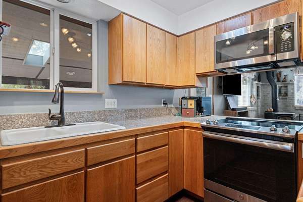 Perfect for the gardening enthusiast, 1.77 acres of beautiful park-like grounds, this private gated property offers space, function, and peaceful surroundings. The 3-bedroom, 2-bath home features a warm and inviting living room with a wood-burning stove perfect for cozy evenings. The kitchen is equipped with stainless steel appliances and flows easily into the main living areas, ideal for everyday living and entertaining. The private primary suite includes its own deck, creating a quiet retreat to enjoy the tranquil setting. Outdoors, the property is fully equipped with an 8-zone irrigation system, 1 acre of Arnold Irrigation rights, and a 2,000-gallon cistern to support the lush landscape and pond. A 520-square-foot garage with workshop provides additional flexibility for storage or projects. The impressive 2,232 sf steel pole building with a 14-foot roll-up door offers excellent space for equipment, hobbies, or recreational vehicles. Plenty of space for RV parking.