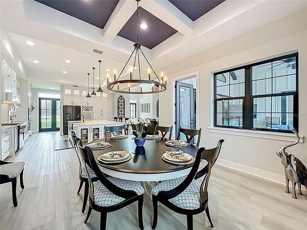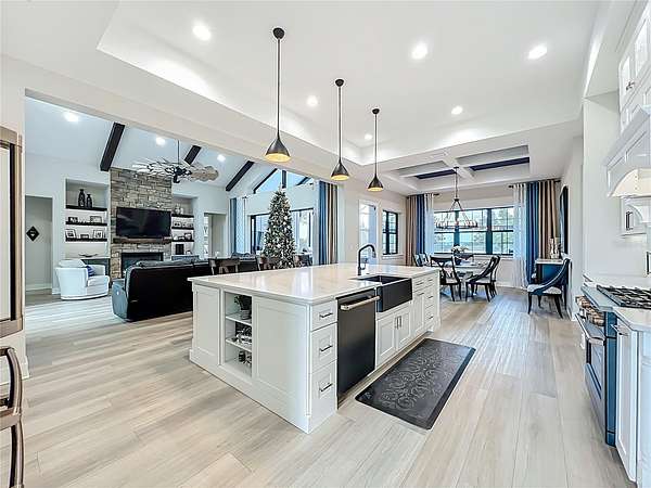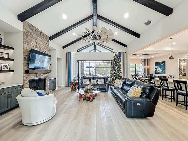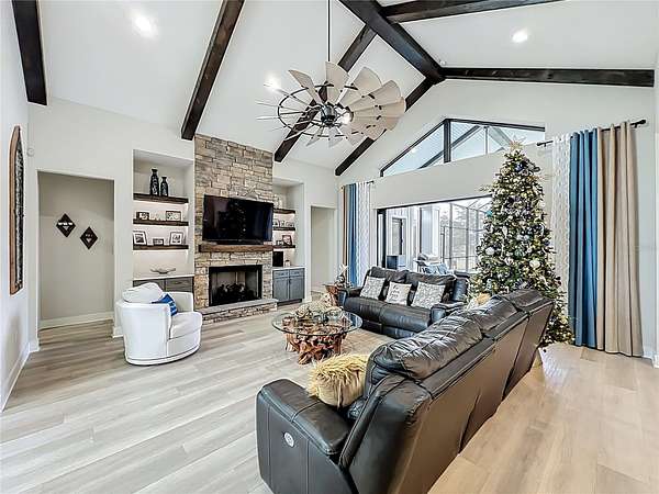 Designed with elegance and functionality in mind, the home features four spacious bedrooms, four-and-a-half baths, a dedicated study, a versatile bonus room and a custom-built mudroom. The main living area showcases soaring ceilings with exposed beams and a statement fireplace, creating a warm yet elevated atmosphere. A set of expansive Multi-Slide pocketing patio doors opens the living space to a large brick paved outdoor patio creating a seamless transition between indoors and out ideal for entertaining or unwinding. Paired with the enclosed resort-style sparkling pool, the home offers a luxurious lifestyle.