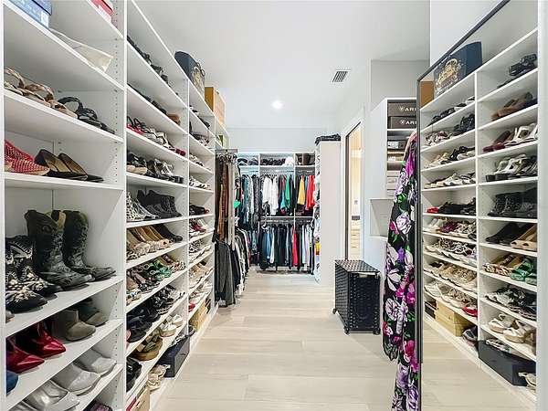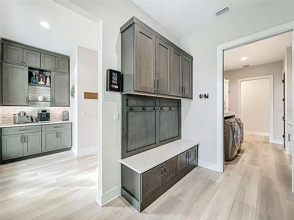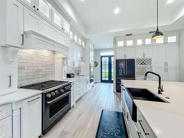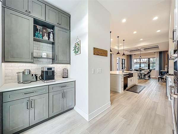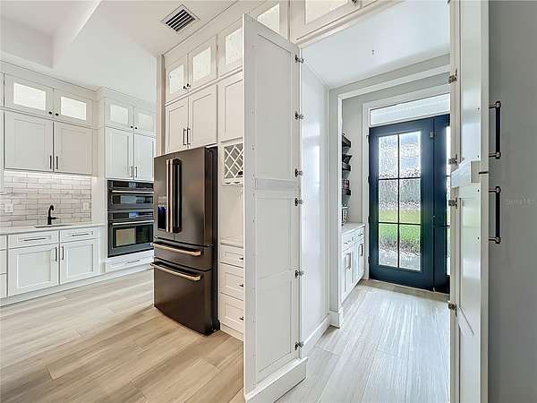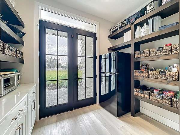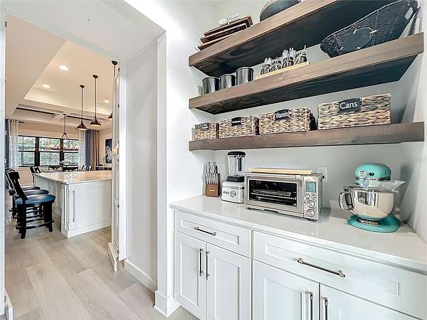 The gourmet kitchen is a true centerpiece, equipped with Cafe appliances featuring a propane 6-burner cooktop, double ovens with microwave, a commercial-grade pizza oven, double-stacked custom cabinetry with extensive hidden storage throughout. A remarkable walk-in hidden pantry offers exceptional space for organization. The separate coffee bar elevates daily routines with a touch of luxury.