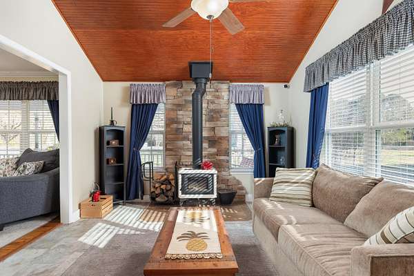 SINGLE LEVEL HOME + POOL | MULTIPLE SHEDS/WORKSHOPS ON 2+ ACRES - This single-level home offers the perfect blend of comfort, space, and functionality inside and out and is truly its own retreat. Step inside to a welcoming living room that flows into a spacious kitchen featuring an abundance of cabinet and counter space with solid-surface counters. A cozy family room/den with a wood stove adds warmth and charm, creating the perfect gathering space. The primary suite offers a walk-in shower and soaking tub. Enjoy mornings on the back deck overlooking the private backyard where you can frequently watch wildlife such as turkey and deer roam the property. Host fun summer weekends relaxing by the above ground pool and gather at the cabana with a fire pit and string lights. You'll find a 350 sq ft shed converted into a cozy cottage with a kitchenette that could be used for a small business, office space, craft room or reading room. The detached garage right next to the home on the property is 26'x30' and provides a single car garage door and plenty of space for storage. The second garage is 30'x30' with a 26'x20' add on, has a 14'x26' carport, and has four 10 ft doors that can fit a camper or boat for storage and has electricity, giving you endless possibilities for hobbies, projects, or future expansion. If you're looking for privacy, convenience, and versatility, this property is the one you've been waiting for!