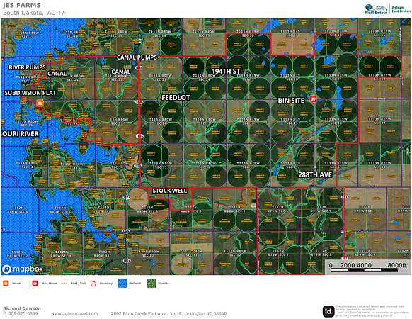 At the heart of JES Farms lies an advanced irrigation system drawing from the Missouri River. It includes 84 Valley center pivots (with 13 corner systems), a 13-mile gravity-fed canal system with a 125-foot elevation drop for efficient low-pressure delivery, and extensive underground piping. This setup supports roughly 12,458 irrigated acres delivering reliable water even in South Dakota’s variable climate (average rainfall ~19 inches). The farms also has 2,333 dryland cropland acres. The farm boasts strong productivity ratings, with top soil classes averaging 93% and an overall average around 84%. FSA data highlights substantial contract bases for corn, wheat, and soybeans. JES Farms also leases 175 acres and that leasehold interest could possiblly be assigned to Buyer.The permit to pump water from the Missouri River was issued by the State Legislature of South Dakota. The permit is for 55,000 acres feet of irrigation water. In 2017, over 250 miles of drain tile was installed for 18 pivots. The 13 pivots system corner units were also installed in 2017.