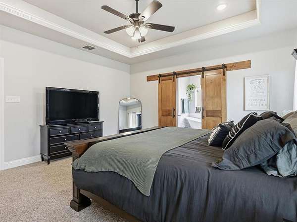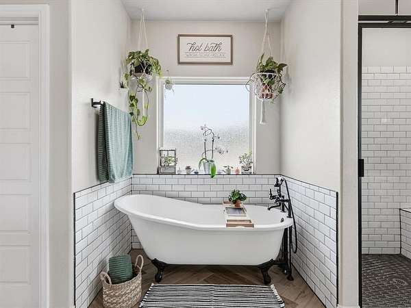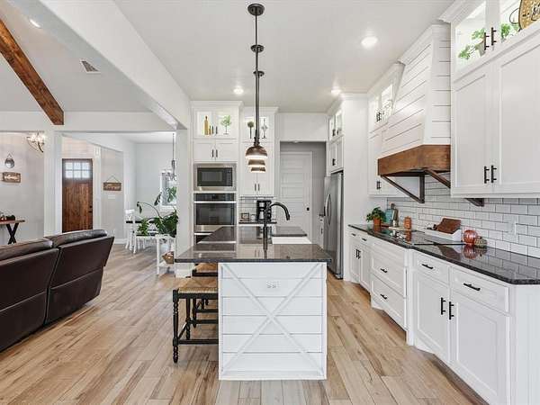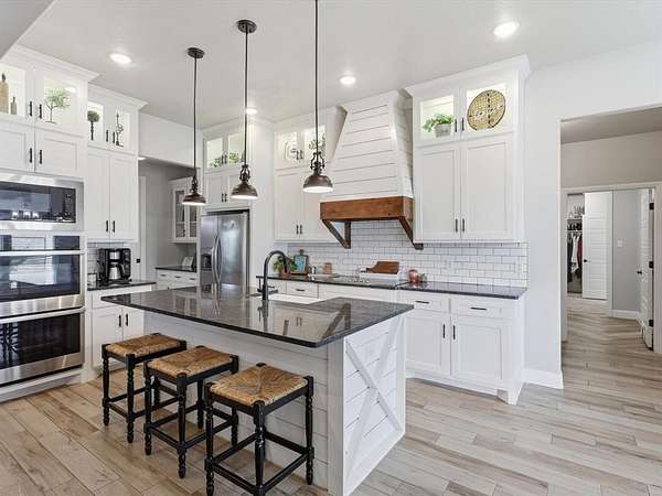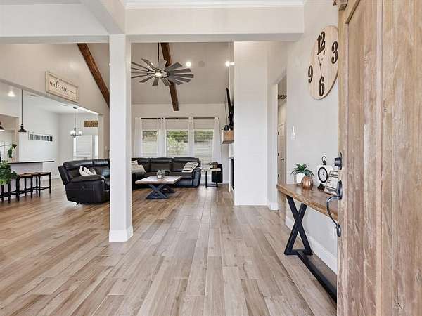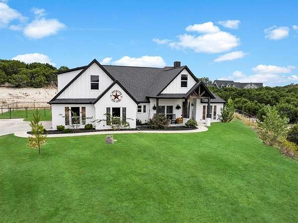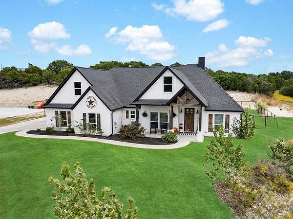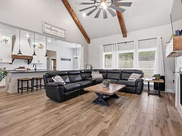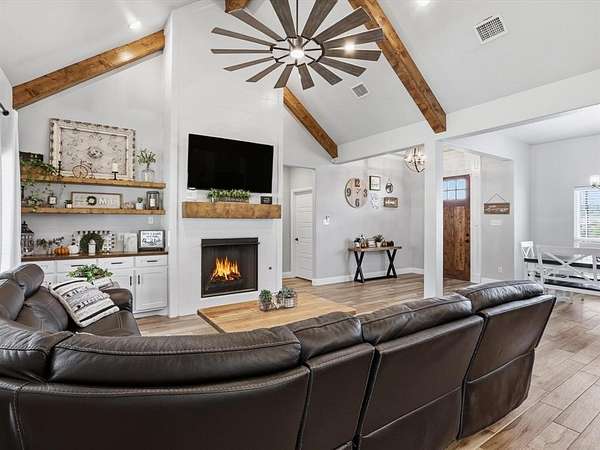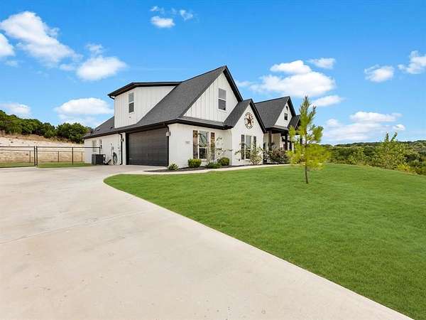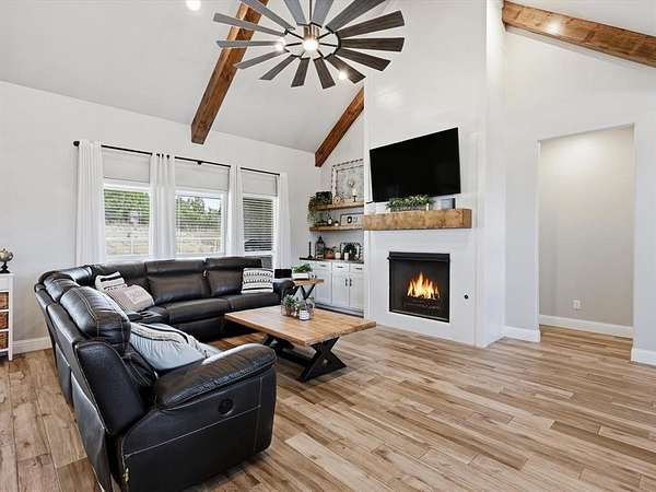 HILLTOP with BREATHTAKING VIEWS, enjoy your morning coffee on the front porch and wine down for sunset! Views including long range views to Downtown Fort Worth. This home blends warmth, function, and custom finish outs all on 2 acres. Completed in 2019 and lightly lived in, the open living area is framed by stained cedar beams, a showpiece windmill ceiling fan with modern farmhouse finishes throughout. The shiplap island kitchen features a farmhouse sink, large breakfast bar, double ovens, built-in microwave, and abundant storage, perfect for everyday cooking or entertaining. Private owner's retreat offers a spa bath with double vanities, a stunning claw foot tub, and separate shower; the custom walk-in closet connects directly to the utility room with herringbone tile for everyday ease. Two secondary bedrooms share a full bath. Upstairs, a 19'x18' unfinished bonus room is ready for media, office, or guest space. Outside, the back acreage is cross fenced with pipe top rail and no climb wire, including, 1 acre up top, ideal for pets, hobby animals, or a future shop. Enjoy your back yard privacy and outdoor grill while star gazing in the Texas sky. Located in Weatherford ISD within Cedar Mountain Estates and minutes to Hwy 199, FM, 730, and Lake Weatherford amenities. Welcome to your little slice of Texas paradise!