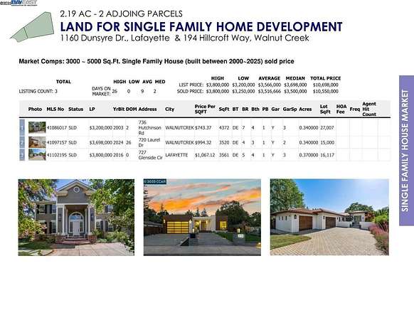 Est $12,905/moThis property is to be sold in conjunction with the adjoining property, 1160 Dunsyre Dr., Lafayette. Two parcels accumulating 2.19 AC, with potential of building multiple single-family homes. Please review the listing of 1160 Dunsyre Dr. for additional information. Additional reports, maps, plans available upon request.