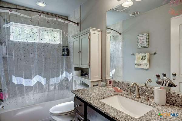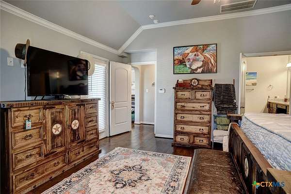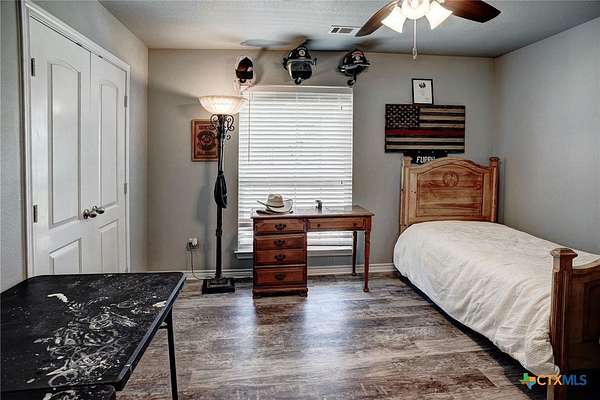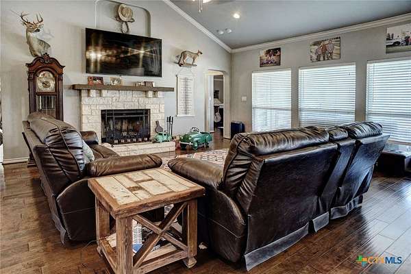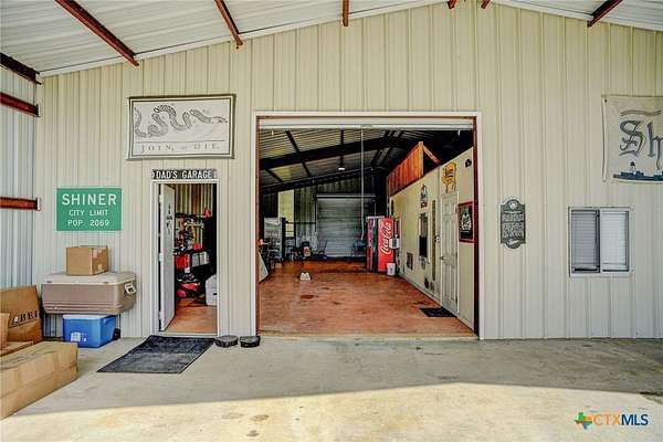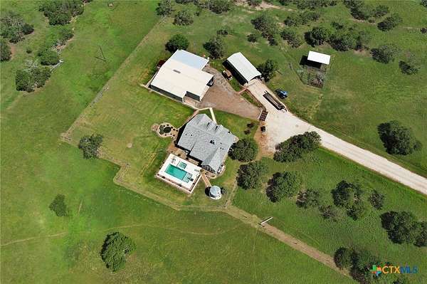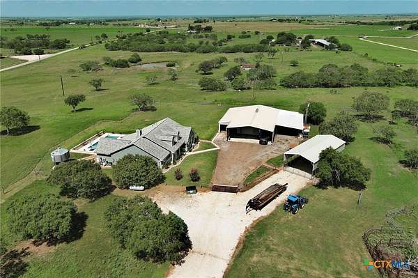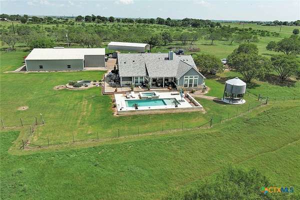 This pristine rural homestead outside of Shiner offers 25.71 acres of land and a custom built 2,503sf, 3 bedroom, 2 bathroom home completed in 2016 as well as a separate detached 1400sf 1 bed 1 bath barndominium living space. The home features granite countertops throughout, beautiful crown moulding, custom cabinetry, vaulted ceilings in the living room and tile and solid engineered hardwood flooring. The expansive master bedroom has a private door opening to the back yard pool area a double vanity ensuite with a large custom tile shower and walk in closet. The living room also features a wood burning fireplace with stone surround and is open to the dining and kitchen areas. The kitchen includes a large center island with breakfast bar, a tremendous amount of working area, built in oven, wine cooler and gas cooktop. From the kitchen you can enter into the laundry/utility room which features a sink, the pantry, space for a washer and dryer as well as any additional refrigerators or freezers. A spacious bonus room is just beyond the utility room which provides a flexible second living room or social space. The home has thousands of square feet of patio and poolside decking. The pool area (installed in 2023) features an attached hot tub, lounging areas, covered patio and a custom gazebo sitting area perfect for a fire pit. The 1,400 sq. ft. detached barndominium includes a 1 bedroom, 1 bath open layout and is perfect for guests or possibly an income producing rental. It is located in the pull through workshop which has a massive work area as well as a covered lean to for boat storage, electric and sewer hookups, and a lien to for covered equipment storage. There is an additional covered RV space detached from the garage. The acreage features improved grasses, cross fences for cattle (barbed and net wire) and three operational water wells. There is a nice set of pipe cattle working pens. The stock pond has been stocked with perch and hybrid blue cats.
