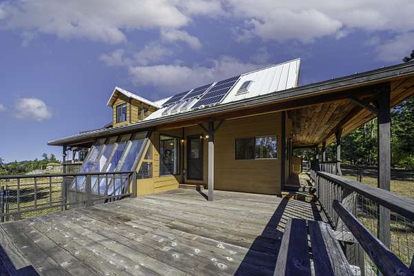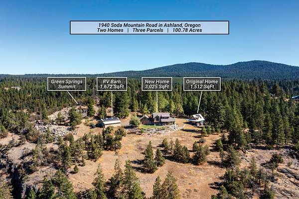 Exceptionally rare family estate or retreat property with two homes on 100+ private acres - including the Green Springs Summit - adjacent to the Cascade-Siskiyou National Monument, just 18 miles from downtown Ashland! Expansive panoramic views of Mt Ashland, Pilot Rock, and Hobart Bluff. New home with Earth Advantage Platinum certification, high vaulted ceilings, exposed timber beams, walls of windows, main-level primary with full ensuite bath and walk-in closet, paver patios, kitchen with leathered granite counters and custom Alder cabinets, powder room, laundry mudroom, spacious media loft, two guest bedrooms, full guest bath, bonus room, and two-car garage. Original home with wrap-around covered porch, kitchen, living and dining areas, main level bedroom, full bath, two upper-level bedrooms with skylights, and half-bath. RV barn, greenhouse, two solar arrays, and potential additional homesites. Vibrant and welcoming mountain community from all walks of life. Inquire for details!