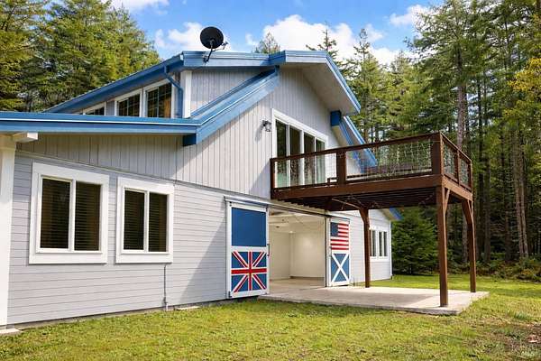 Structurally engineered and custom-built for strength, longevity, and flexibility, this exceptional home offers 2,700 sq. ft. of living space plus a 1,870 sq ft. finished workshop/garage on 22 private, usable acres surrounded by majestic redwoods and a year-round creek. Designed with a reverse floor plan to maximize light and views, the upper level features vaulted ceilings, exposed beams, skylights, rich hickory floors, and a spacious deck overlooking the forested landscape. The chef's kitchen is the centerpiece of this home with premium Viking appliances, an oversized 18' island, double ovens, a farmhouse sink, 10ft tall custom cabinetry, and a walk-in pantryideal for cooking for large gatherings, and entertaining. The primary bedroom is light-filled with a full bathroom and a walk-in closet. Downstairs includes two bedrooms, a full bath, a laundry room, and direct access to the expansive workshop, ideal for hobbies, vehicles, a home business, studio, gym, or future living expansion. The acreage offers trails through redwood groves, a year-round creek, open usable areas, multiple RV hookups with a bathhouse, and a high-producing well. RR-5 zoning, with potential RR-2, allows lot splits, additional homes, or ADU opportunities, through the application process(buyer to verify), creating both lifestyle and investment value. A rare combination of quality construction, privacy, and possibilityyour own Northern California retreat.